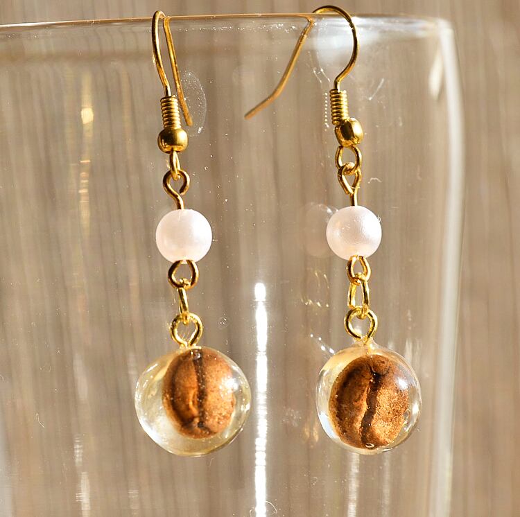 本物のコーヒー豆をまんまるレジンに閉じ込めたピアスです。