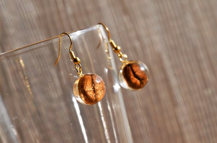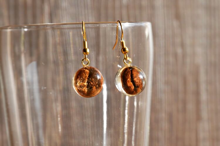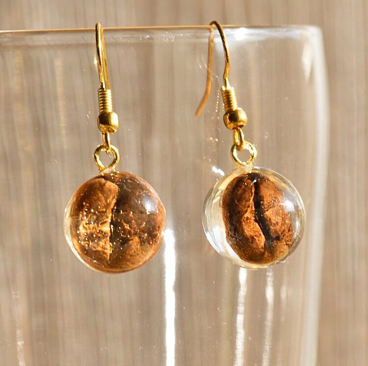 本物のコーヒー豆をまんまるレジンに閉じ込めた、ピアスです。