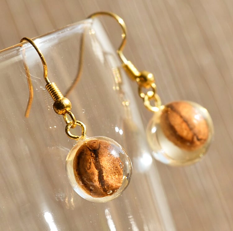 本物のコーヒー豆をまんまるレジンに閉じ込めたピアスです。