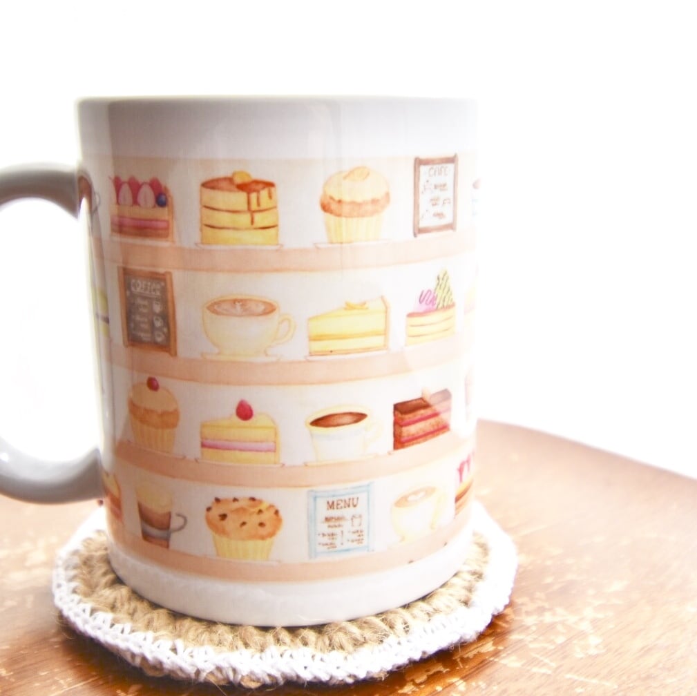 実際に水彩画を描いて絵本の1ページのようなテイストに仕上げた、ほっこりかわいいコーヒーやカフェラテ、ケーキたち。