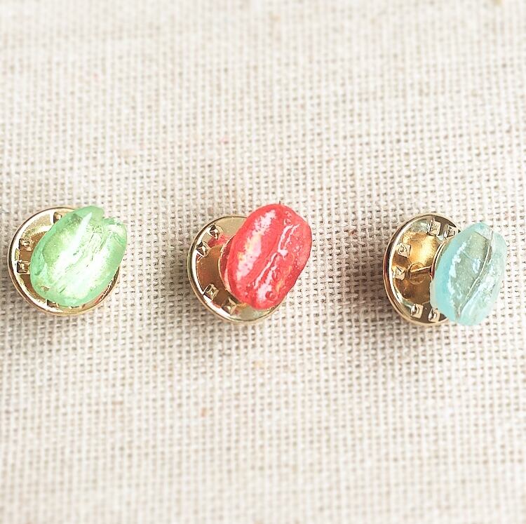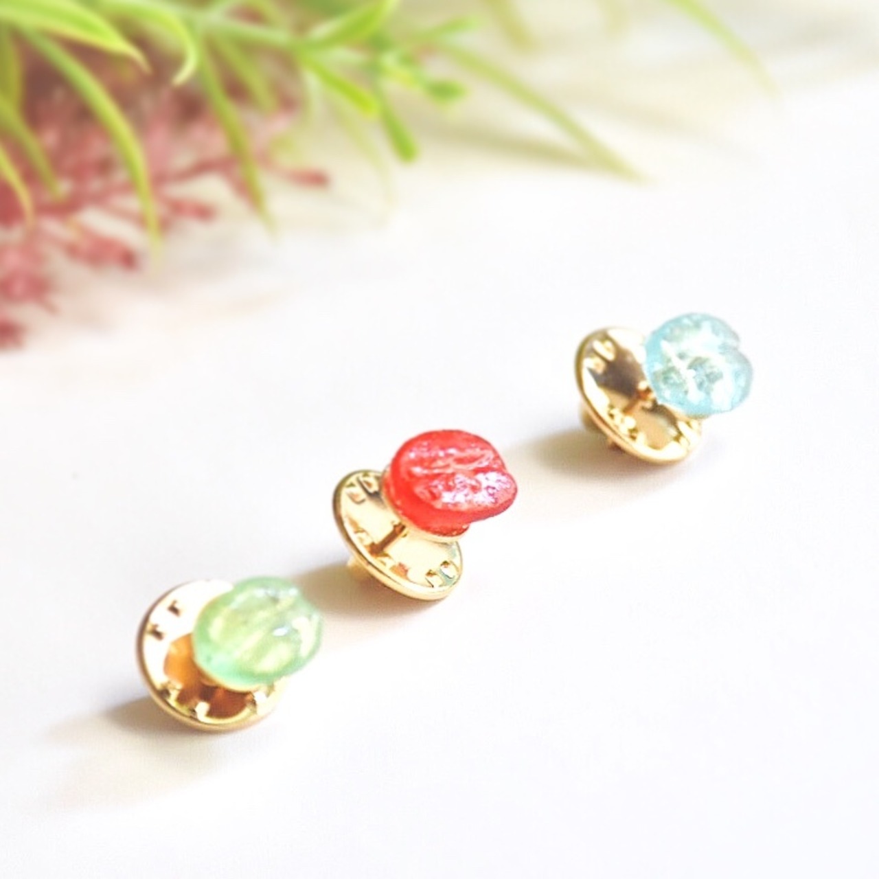 色ガラスやキャンディーのような透明感が美しい、キラキラのレジン製コーヒー豆ピンズです。