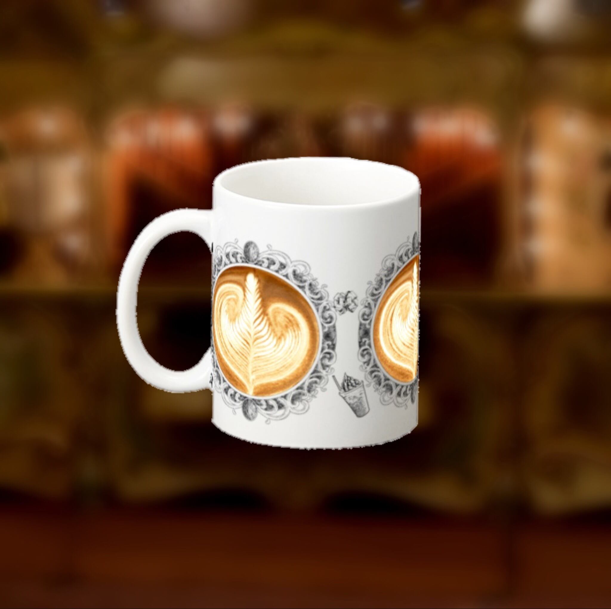 上品な額縁に飾られた絵画のような、繊細なリーフのラテアートのマグカップです。