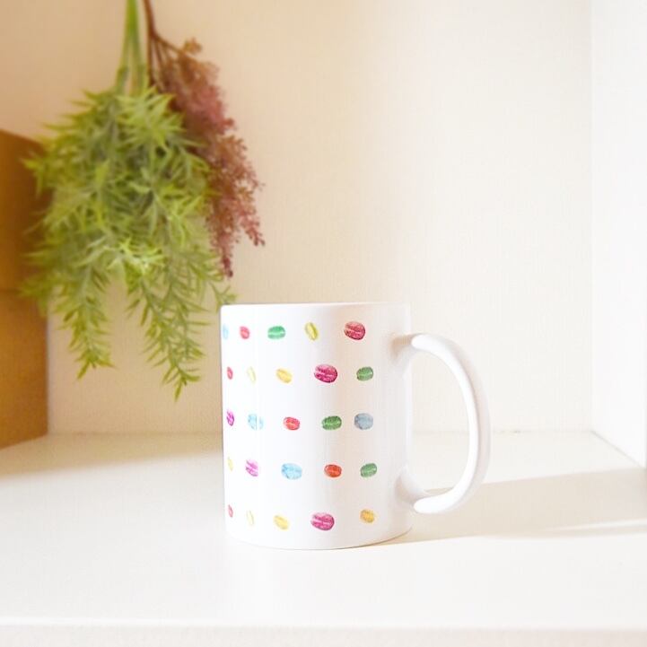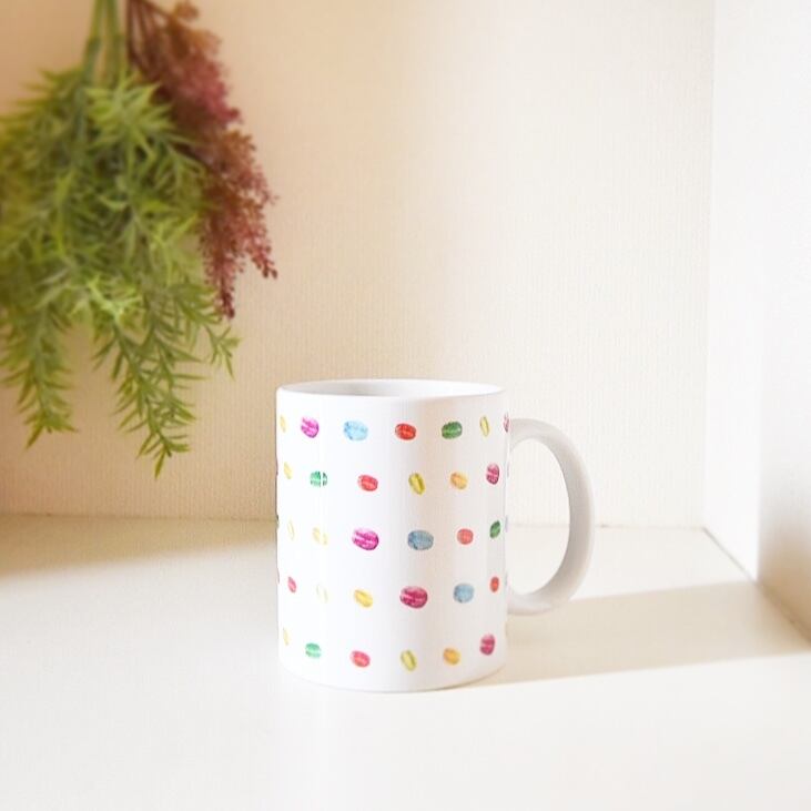 まるでキャンディーみたいな元気いっぱいのポップなカラーがかわいい、コーヒー豆模様のマグカップです。