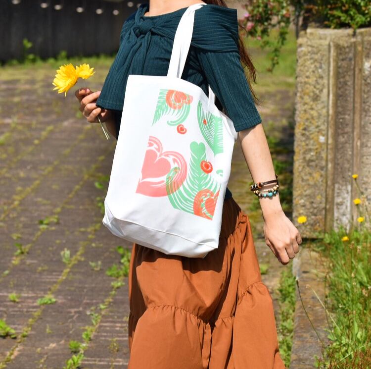 重なった赤と緑のラテアート模様が印象的なトートバッグです。