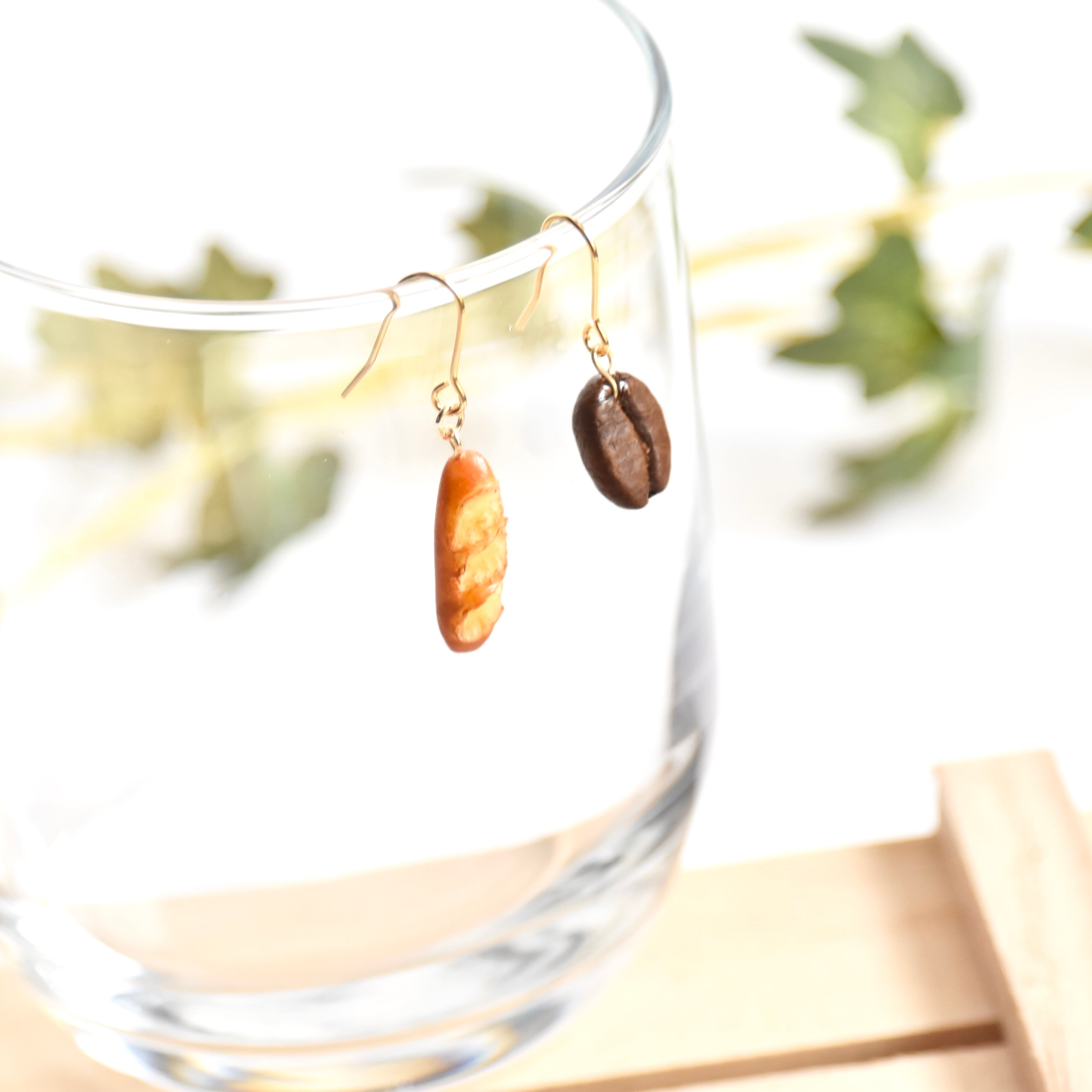 ミニチュアベーカリーカフェ*バタール(ドゥ・リーヴル)と本物コーヒー豆ピアス/イヤリング【個別発送】