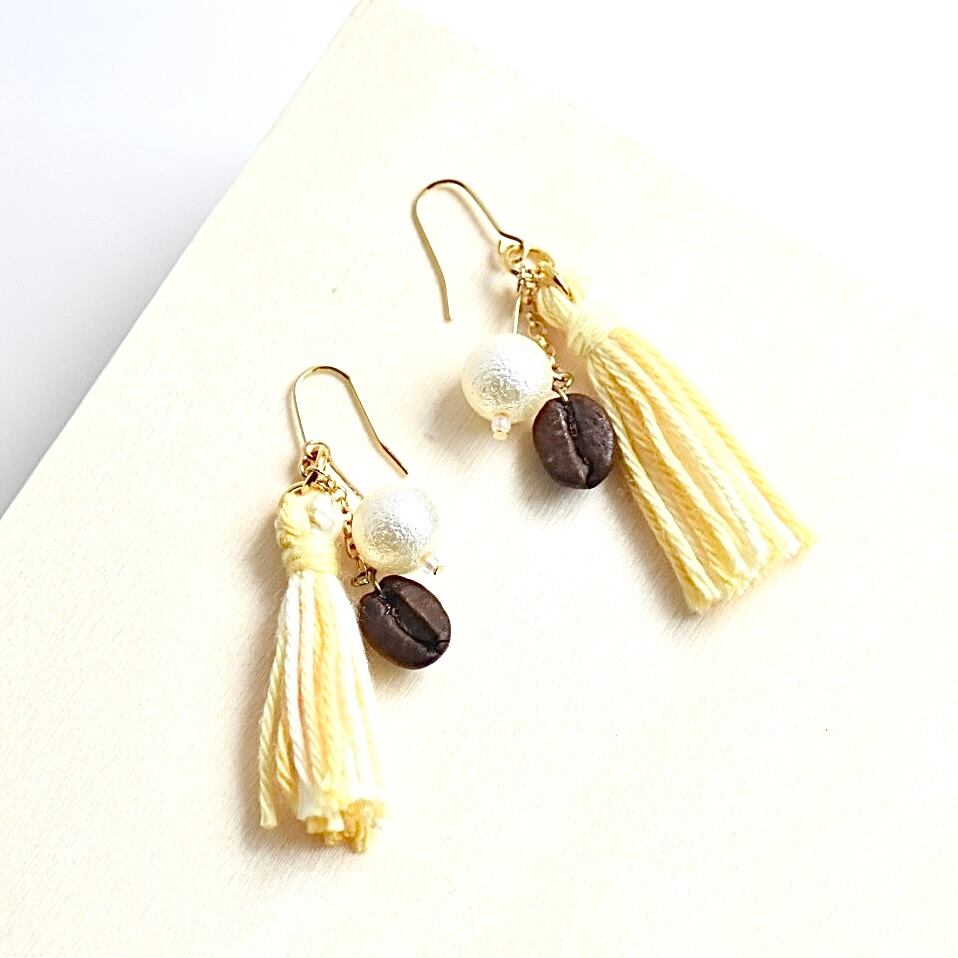 大人の上品さを演出してくれる、コーヒー豆とタッセル、コットンパールをあしらったシンプルエレガントなピアス/イヤリングです。