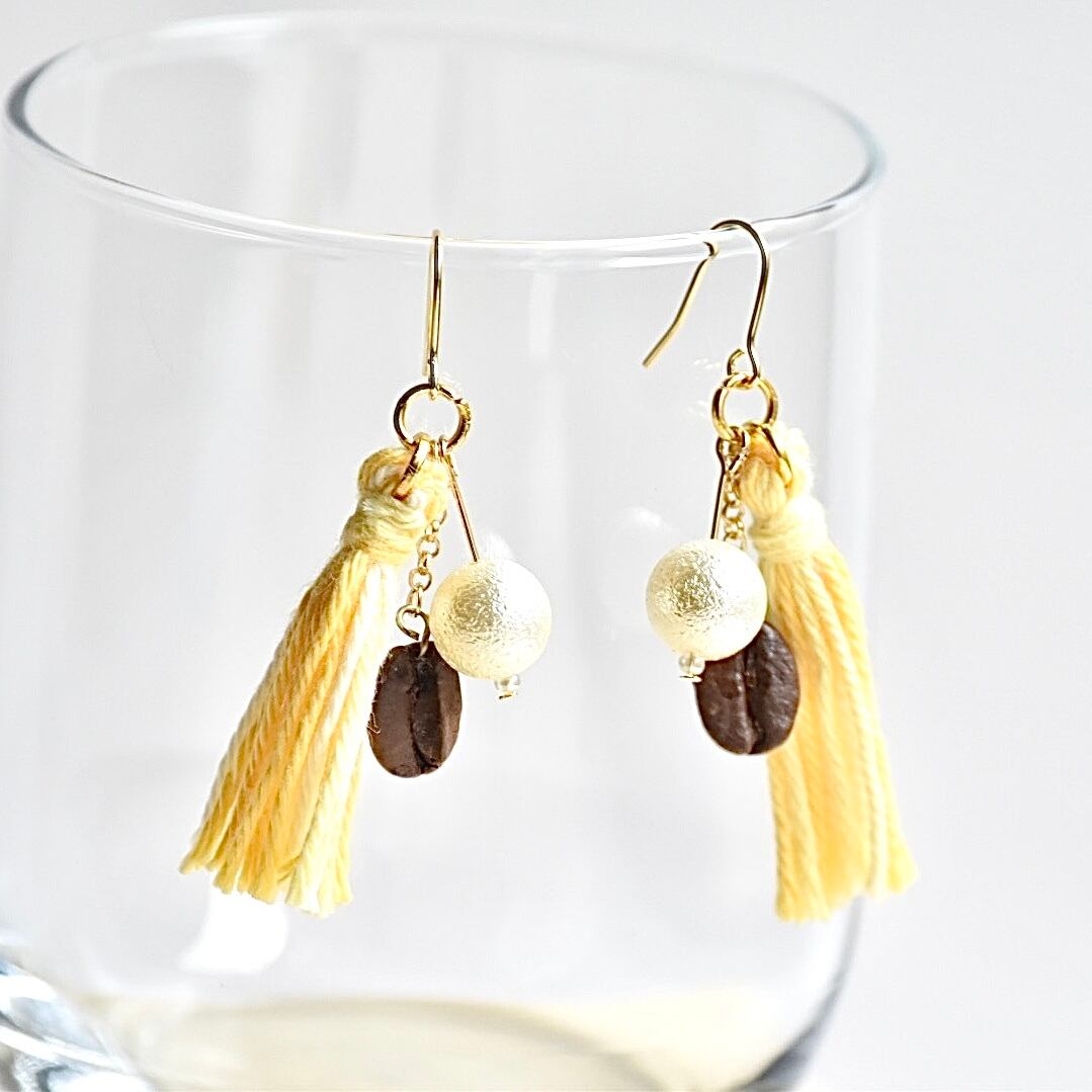 本物コーヒー豆がゆらゆら揺れる♪ふっくらレース糸のシンプルタッセルピアス/イヤリング サンライトグラデーションイエロー(黄色×薄黄色)パールL【個別発送】