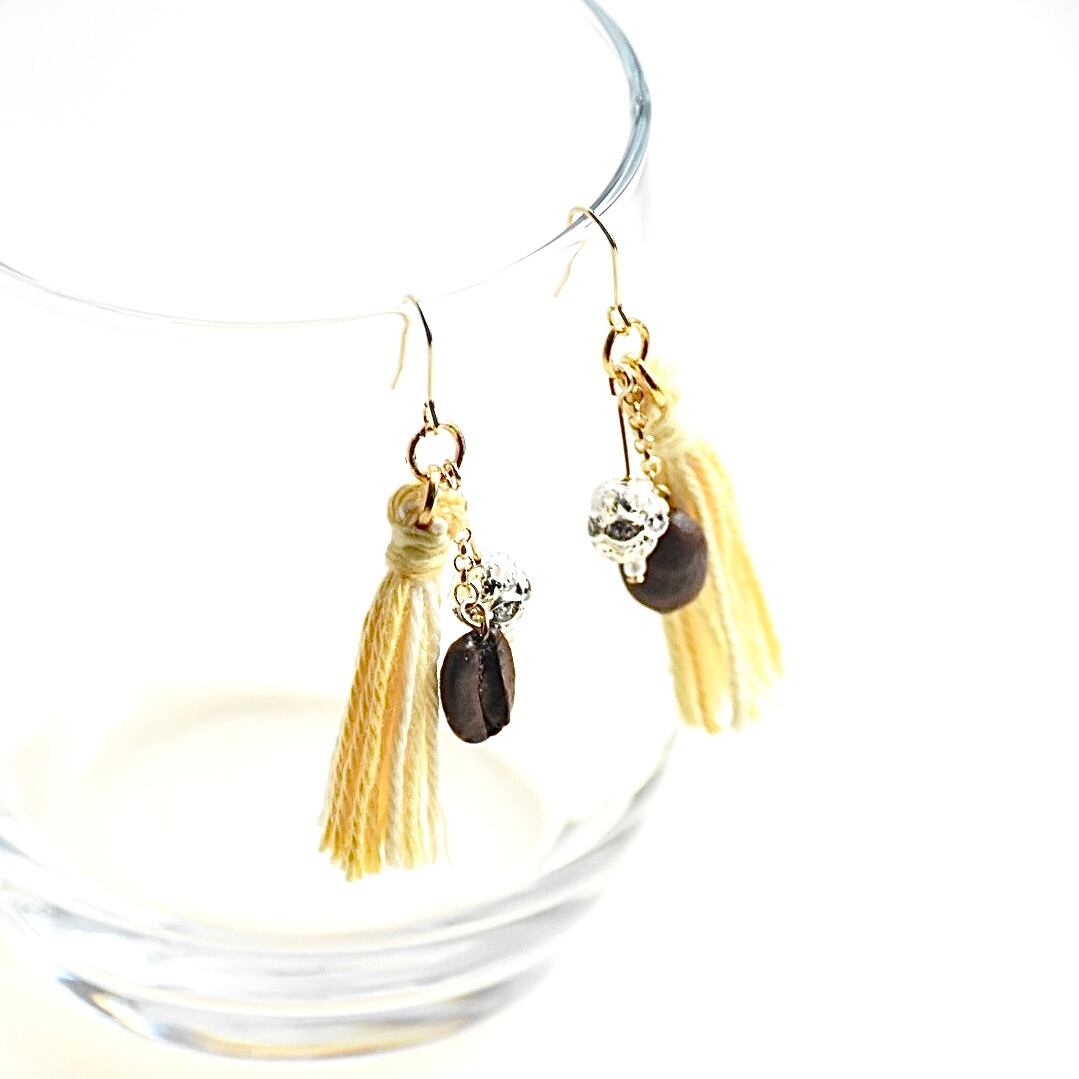 本物コーヒー豆がゆらゆら揺れる♪ふっくらレース糸のシンプルタッセルピアス/イヤリング サンライトグラデーションイエロー(黄色×薄黄色)ロンデル【個別発送】