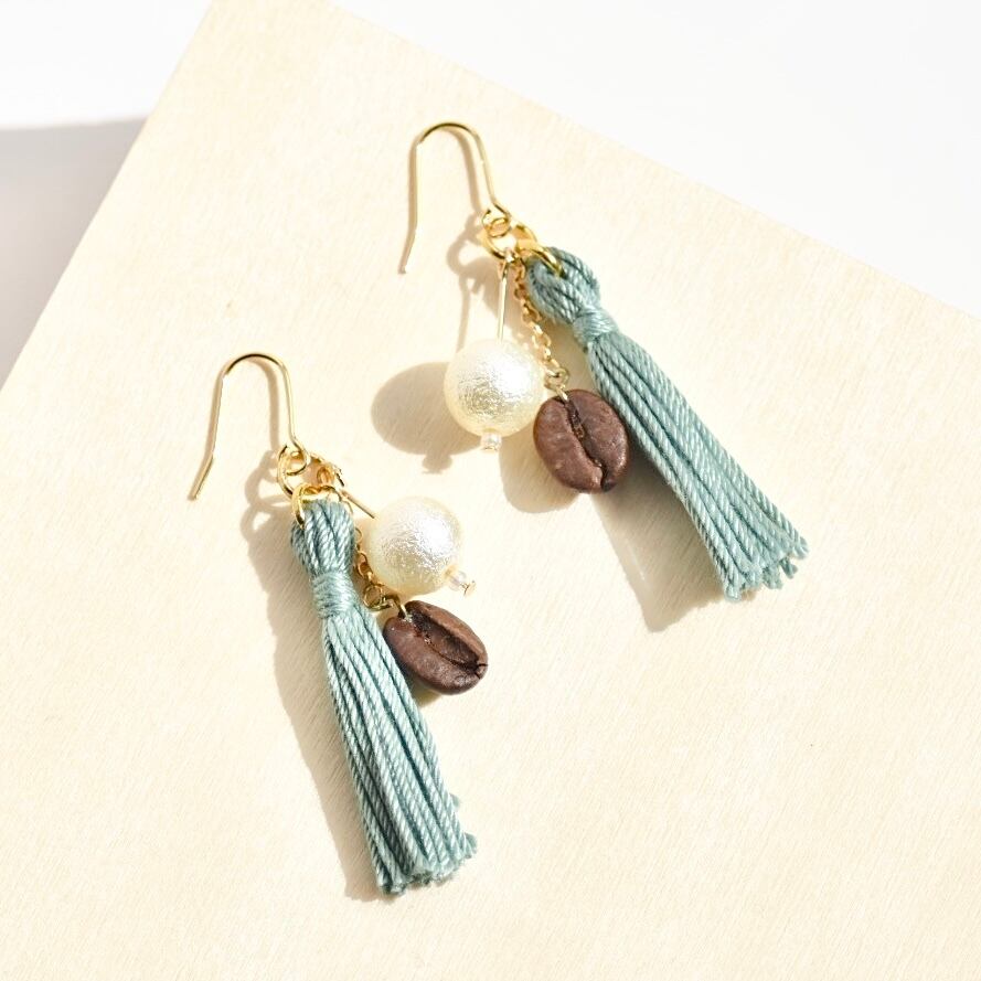 本物コーヒー豆がゆらゆら揺れる♪ふんわりレース糸のシンプルタッセルピアス/イヤリング モスミントグリーン(裏葉色)パールL【個別発送】