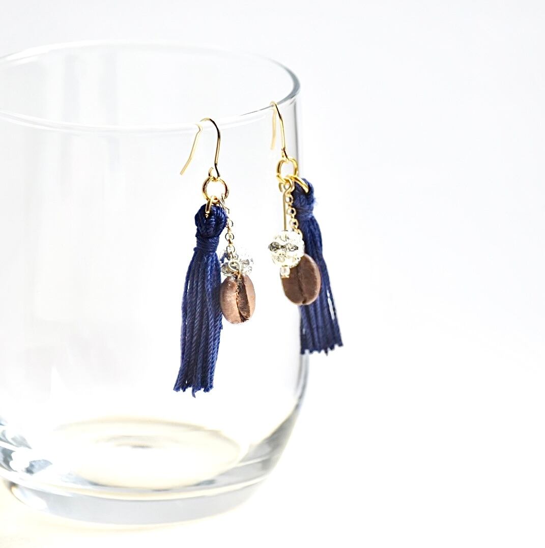 本物コーヒー豆がゆらゆら揺れる♪ふんわりレース糸のシンプルタッセルピアス/イヤリング インディゴネイビー(紺色)ロンデル【個別発送】