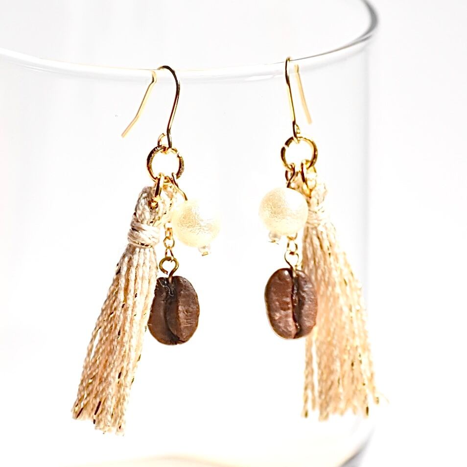 大人の上品さを演出してくれる、コーヒー豆とタッセル、コットンパールをあしらったシンプルエレガントなピアス/イヤリングです。