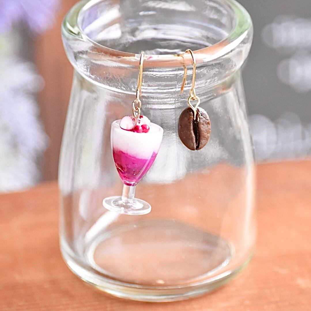 秋の喫茶店*スイートベリーなアイスカフェモカ(カフェオレ) ミニチュアと本物コーヒー豆ピアス/イヤリング オリジナルディスプレイ台紙付き【個別発送】