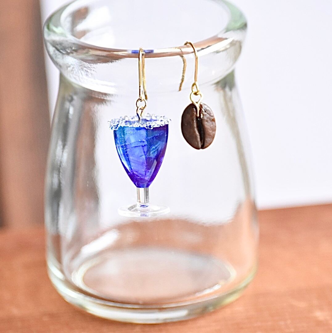 冬の喫茶店*きらきらシュガーの星空スカッシュ(ソーダ・サイダー) ミニチュアと本物コーヒー豆ピアス/イヤリング オリジナルディスプレイ台紙付き【個別発送】