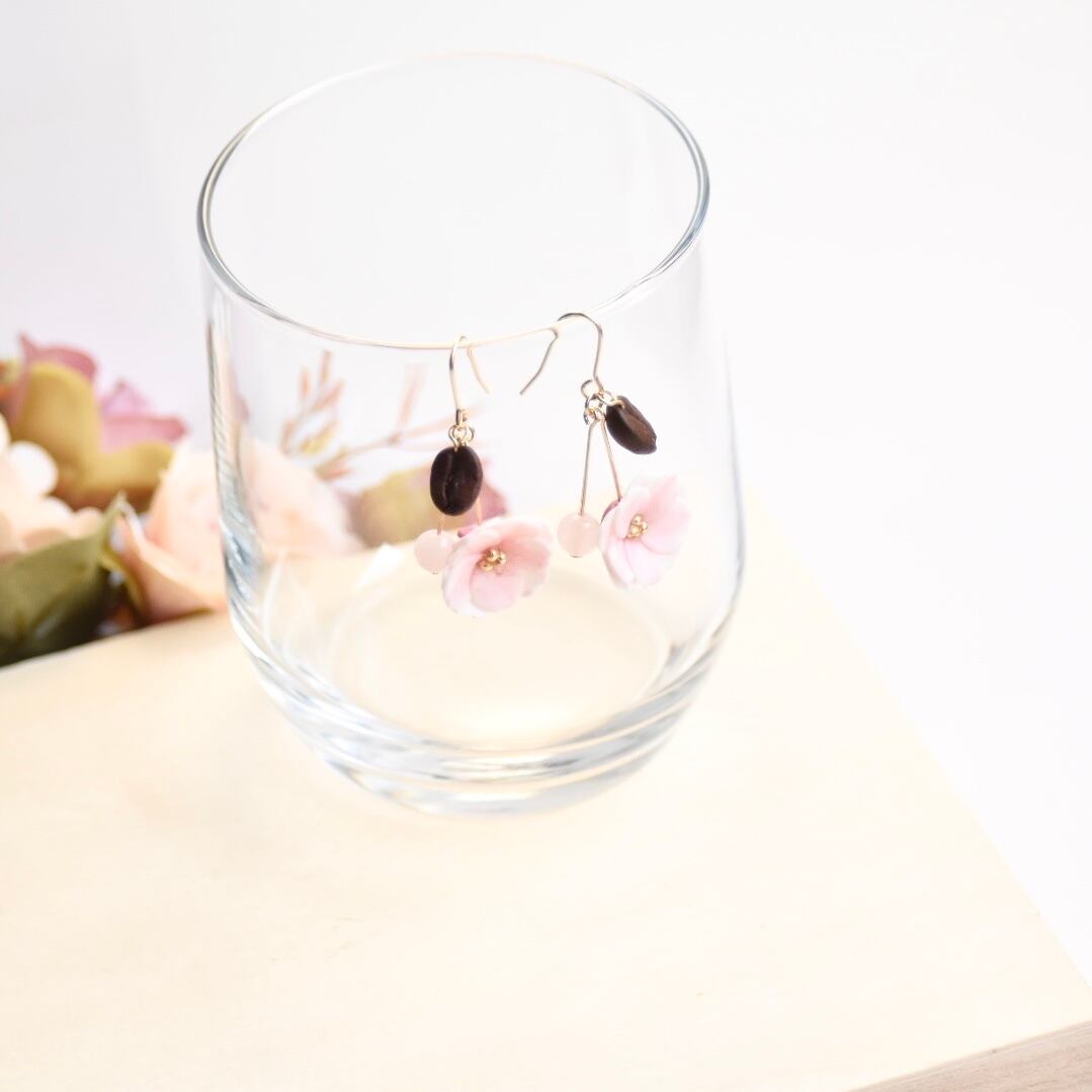 うつろう季節の水彩庭園カフェ*八重桜とローズクォーツ&本物コーヒー豆ピアス/イヤリング『ワルツ』