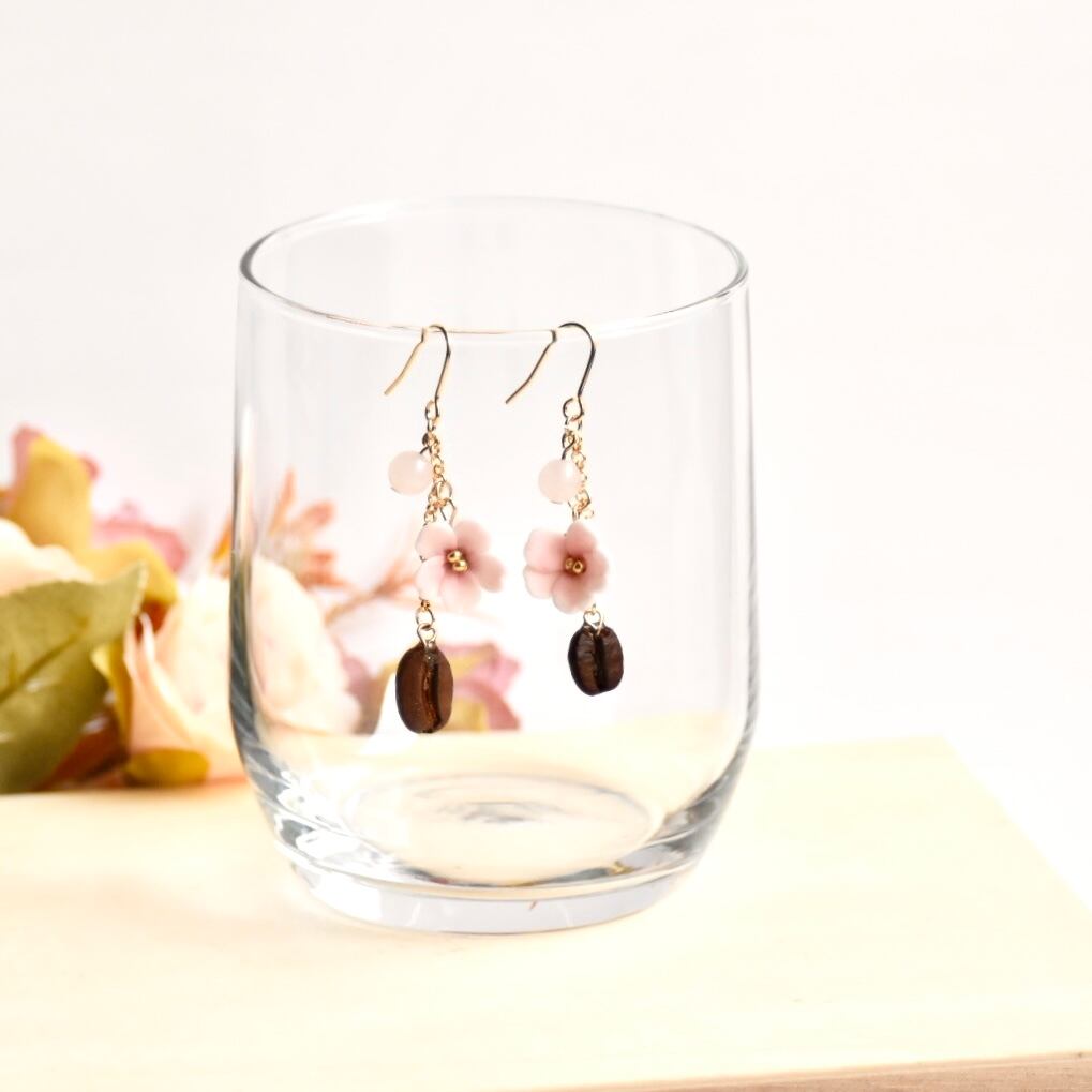 うつろう季節の水彩庭園カフェ*桜とローズクォーツ&本物コーヒー豆ピアス/イヤリング『ララバイ』