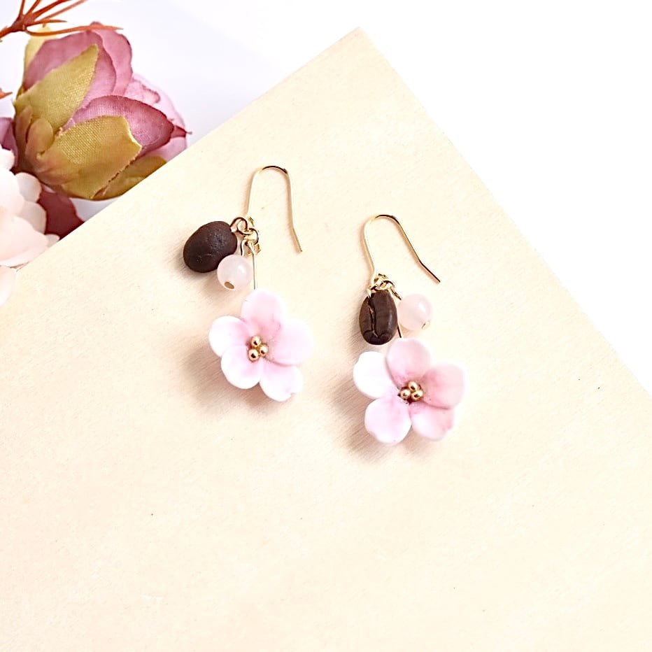 うつろう季節の水彩庭園カフェ*桜とローズクォーツ&本物コーヒー豆ピアス/イヤリング『メヌエット』