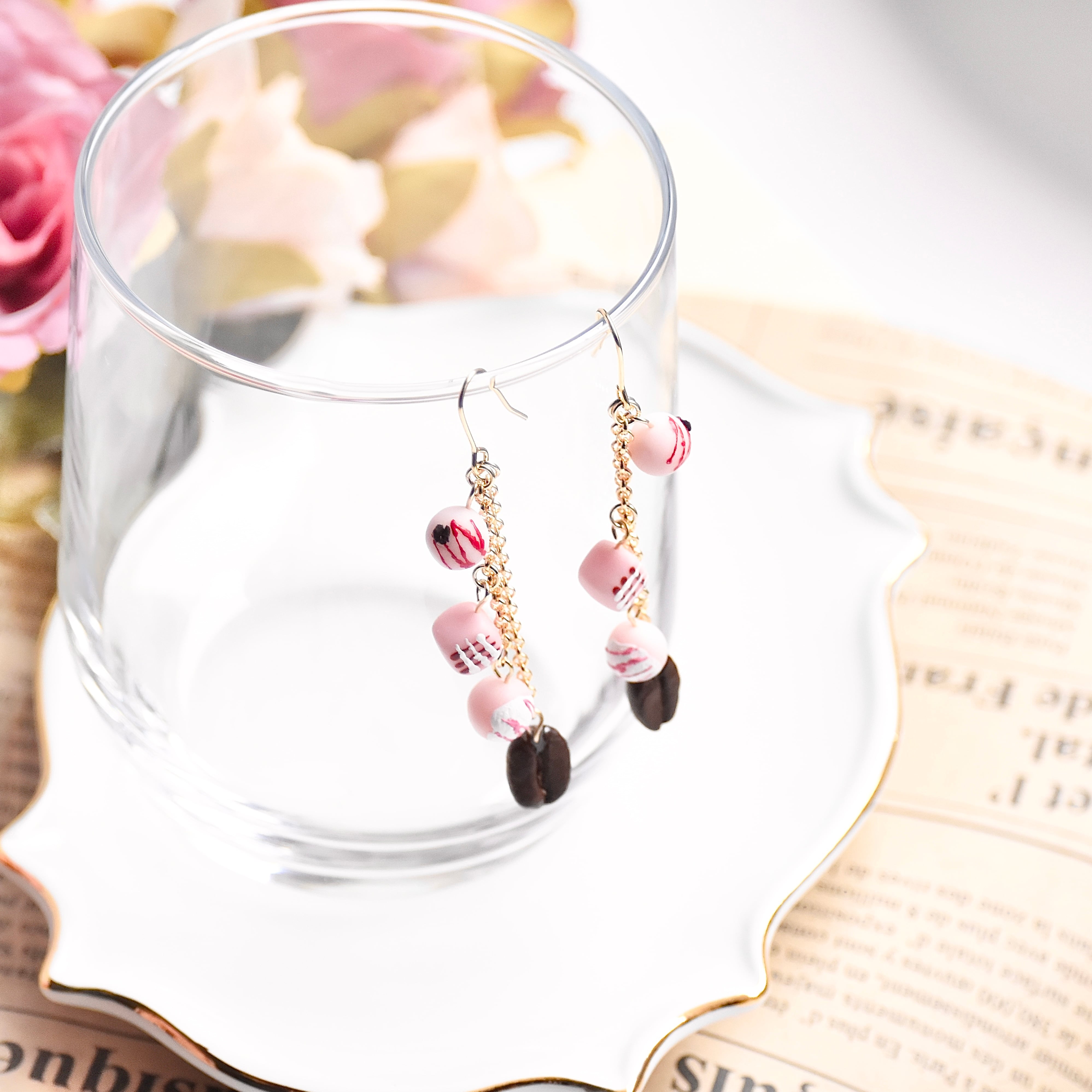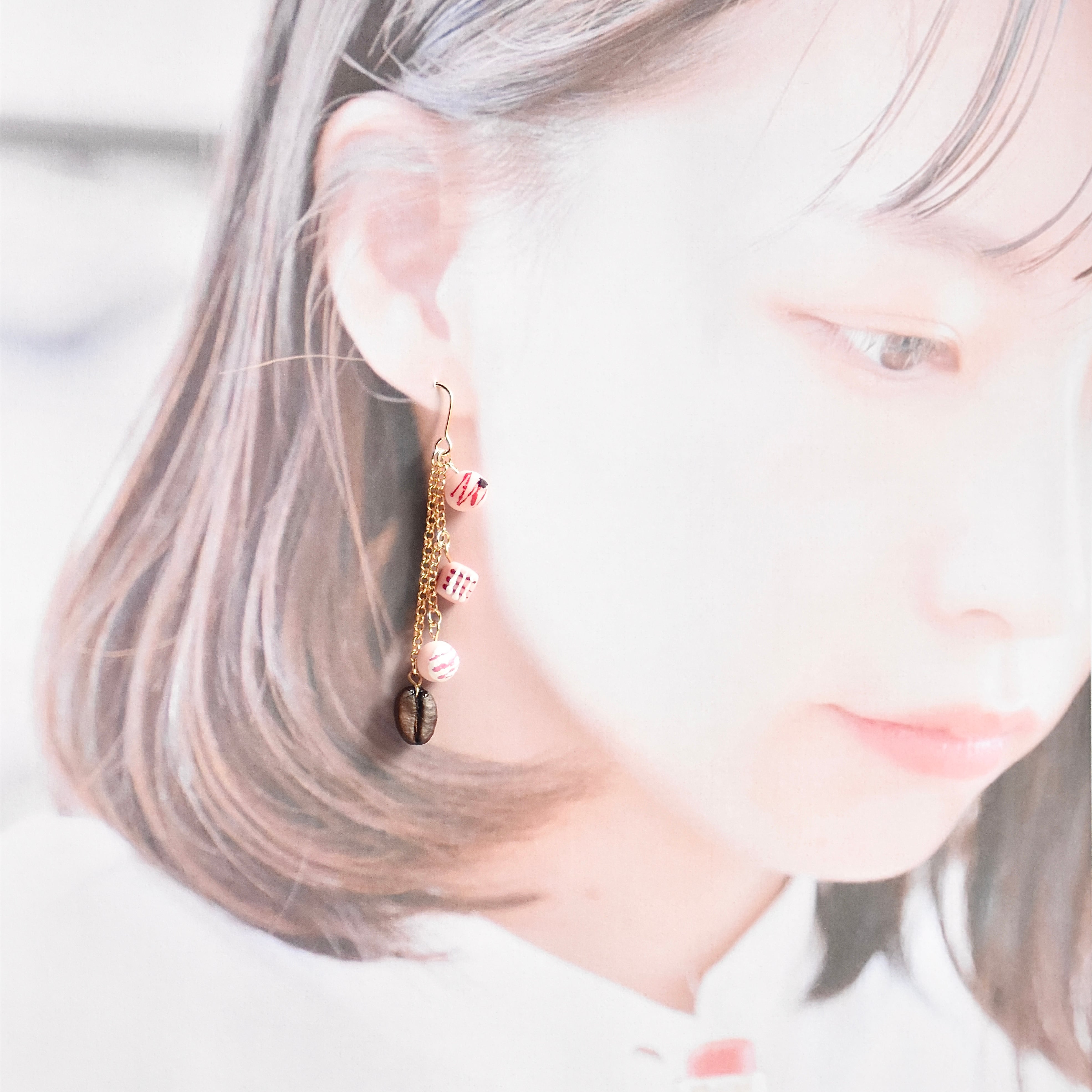 ミニチュアショコラトリーカフェ*いちごみるくなボンボンショコラと本物コーヒー豆ピアス/イヤリング【個別発送】