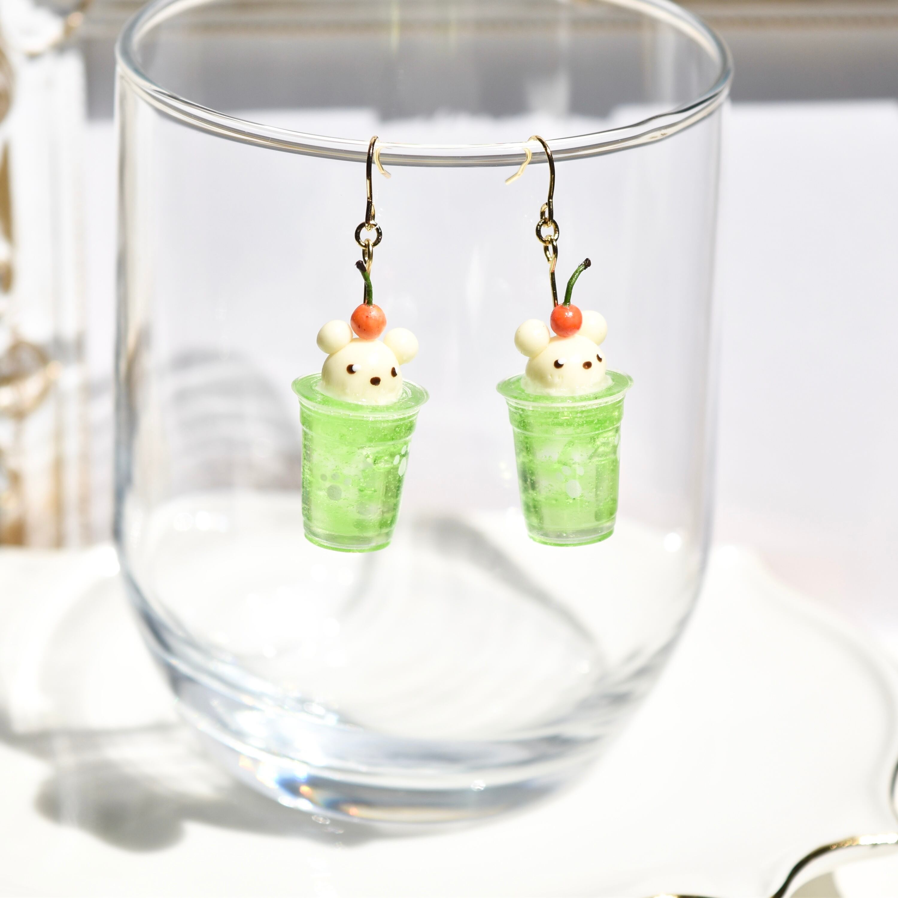 どうぶつたちの隠れ家カフェ*メロンのくまさんクリームソーダ(ソーダ・サイダー) ミニチュア ピアス/イヤリング オリジナルディスプレイ台紙付き【個別発送】