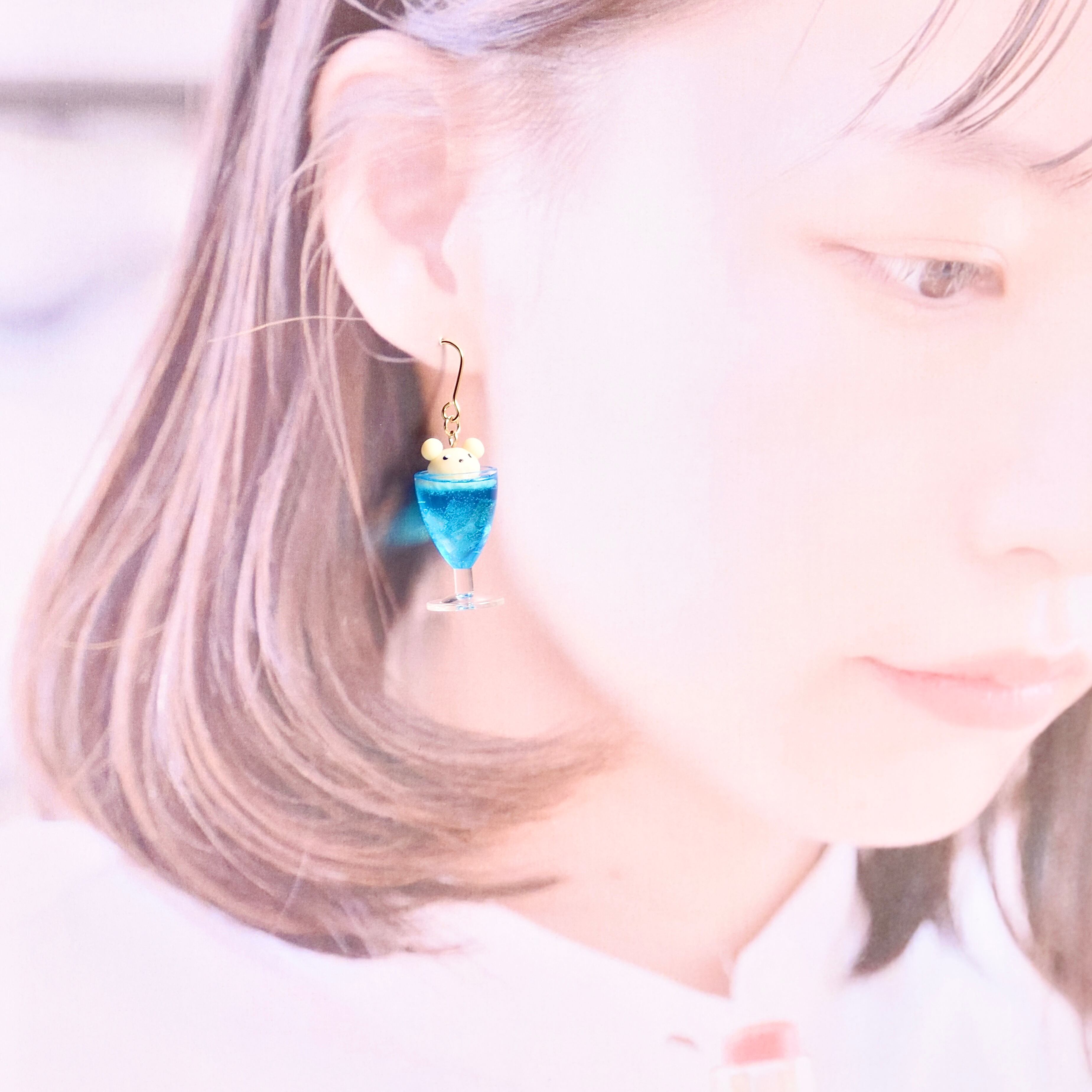 どうぶつたちの隠れ家カフェ*ブルーラムネのくまさんクリームソーダ(サイダー) ミニチュアと本物コーヒー豆ピアス/イヤリング*オリジナルディスプレイ台紙付【個別発送】