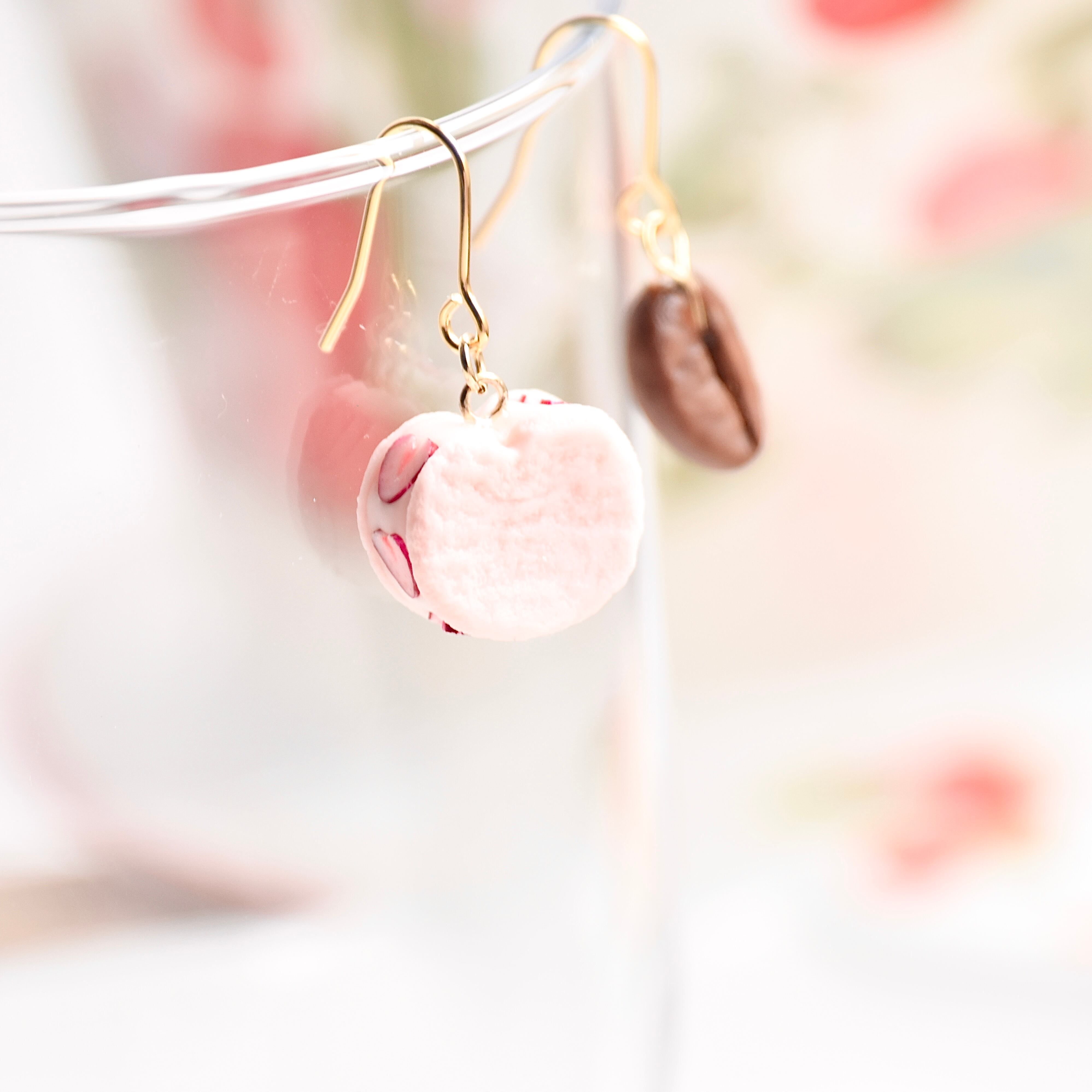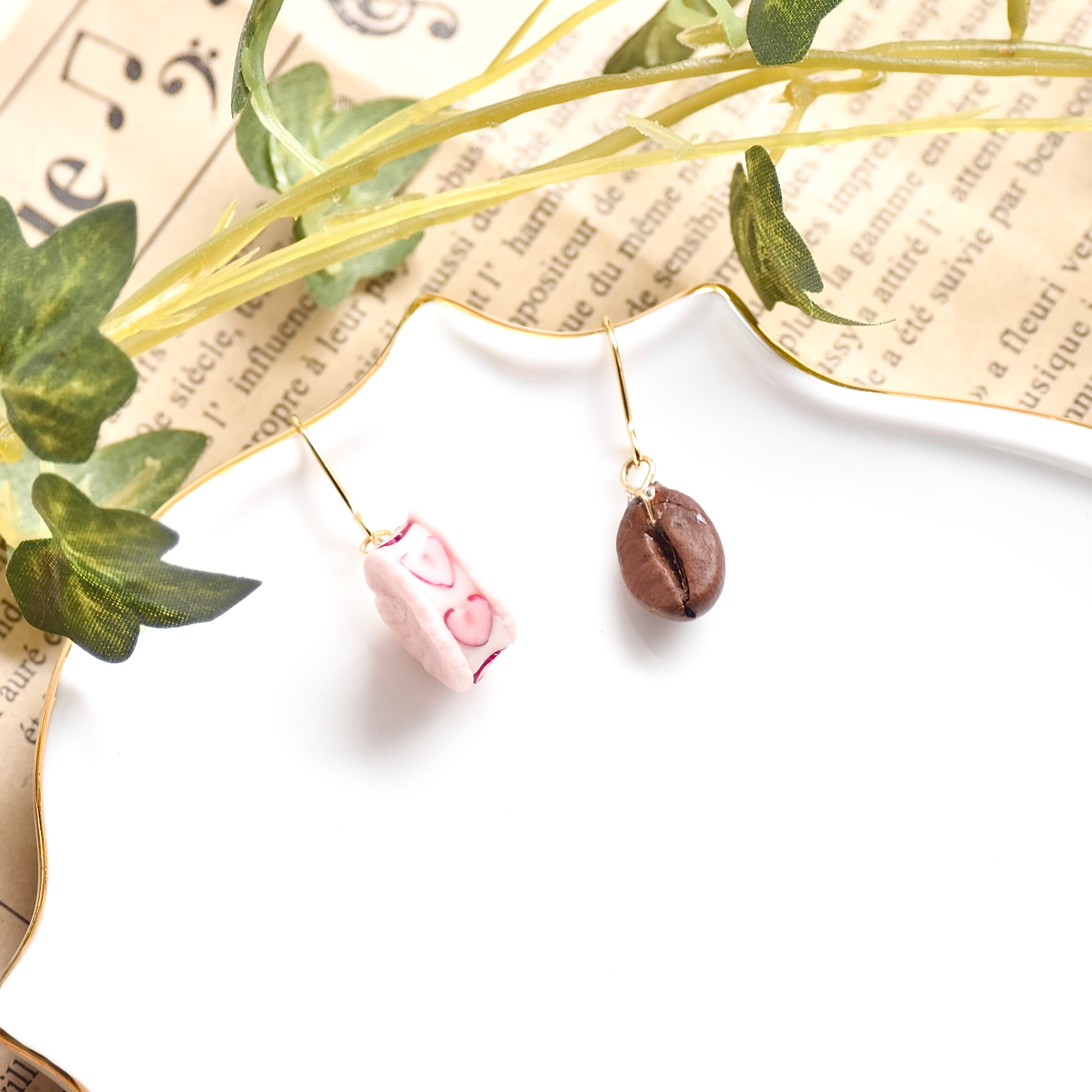 ミニチュアベーカリーカフェ*ピンクハートのいちごフルーツサンドと本物コーヒー豆ピアス/イヤリング【個別発送】