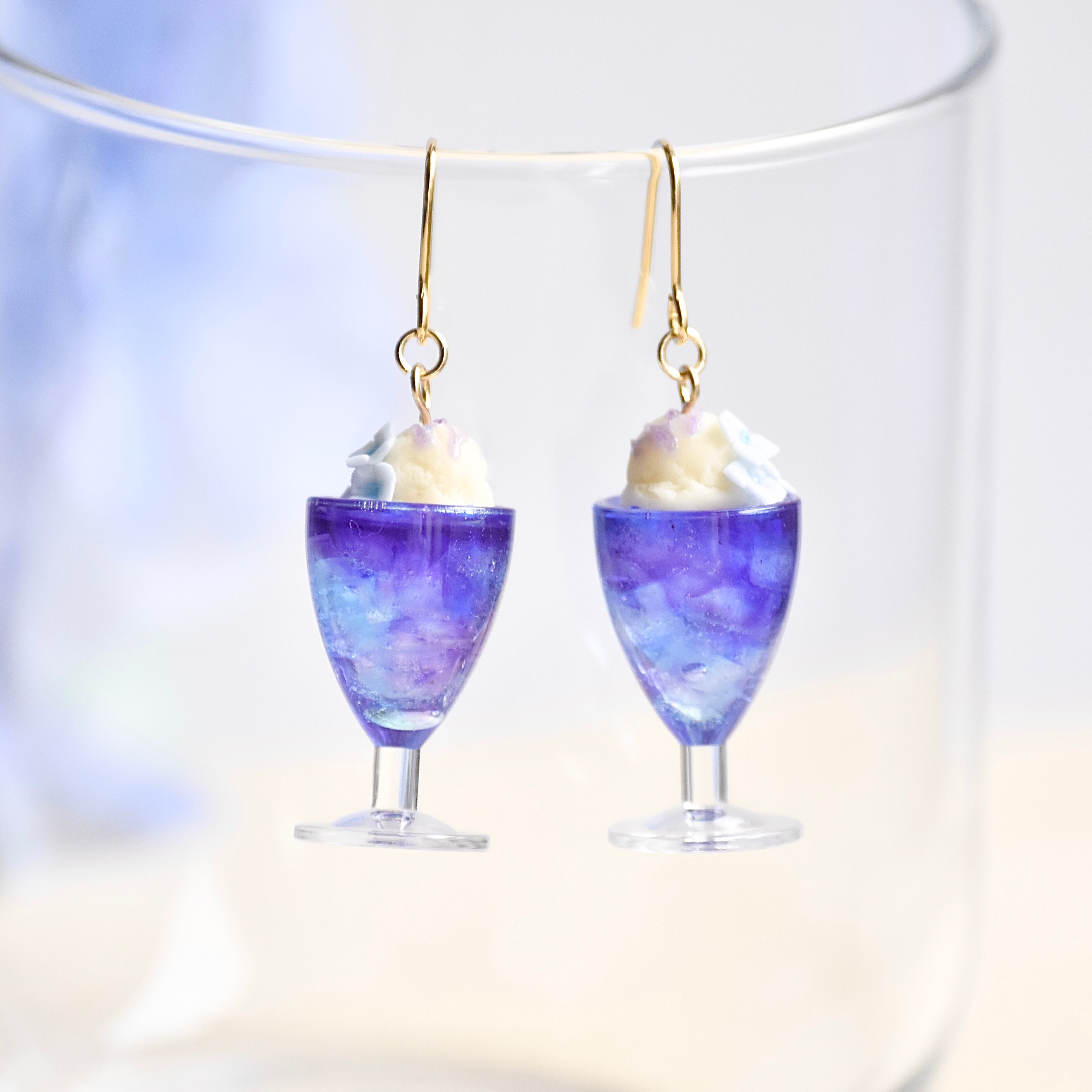 夏の喫茶店*きらきら零れる紫陽花のクリームソーダ(サイダー) ミニチュア ピアス/イヤリング オリジナルディスプレイ台紙付き【個別発送】