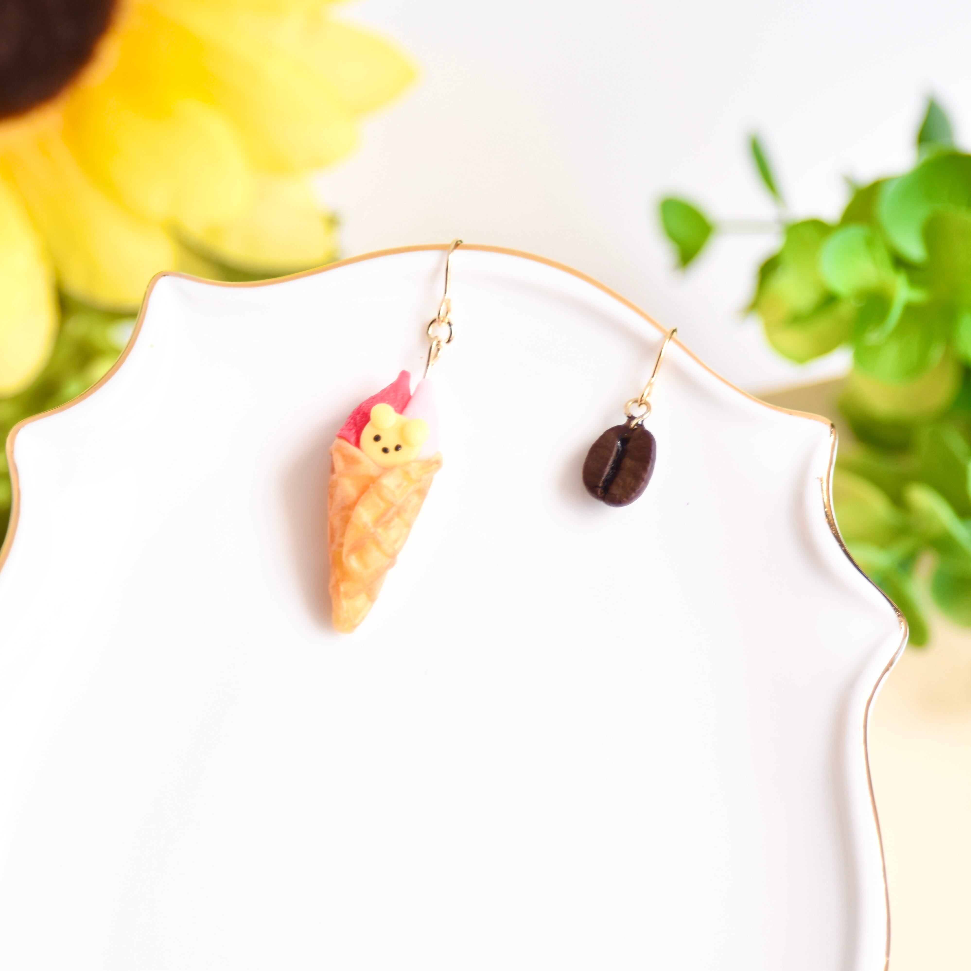 Prism coffee beanの「テーマ×カフェ」シリーズより、「パステルテディベアのジェラートカフェ」のメニューをイメージしたスイーツやドリンクのミニチュアをあしらったピアス/イヤリングです。