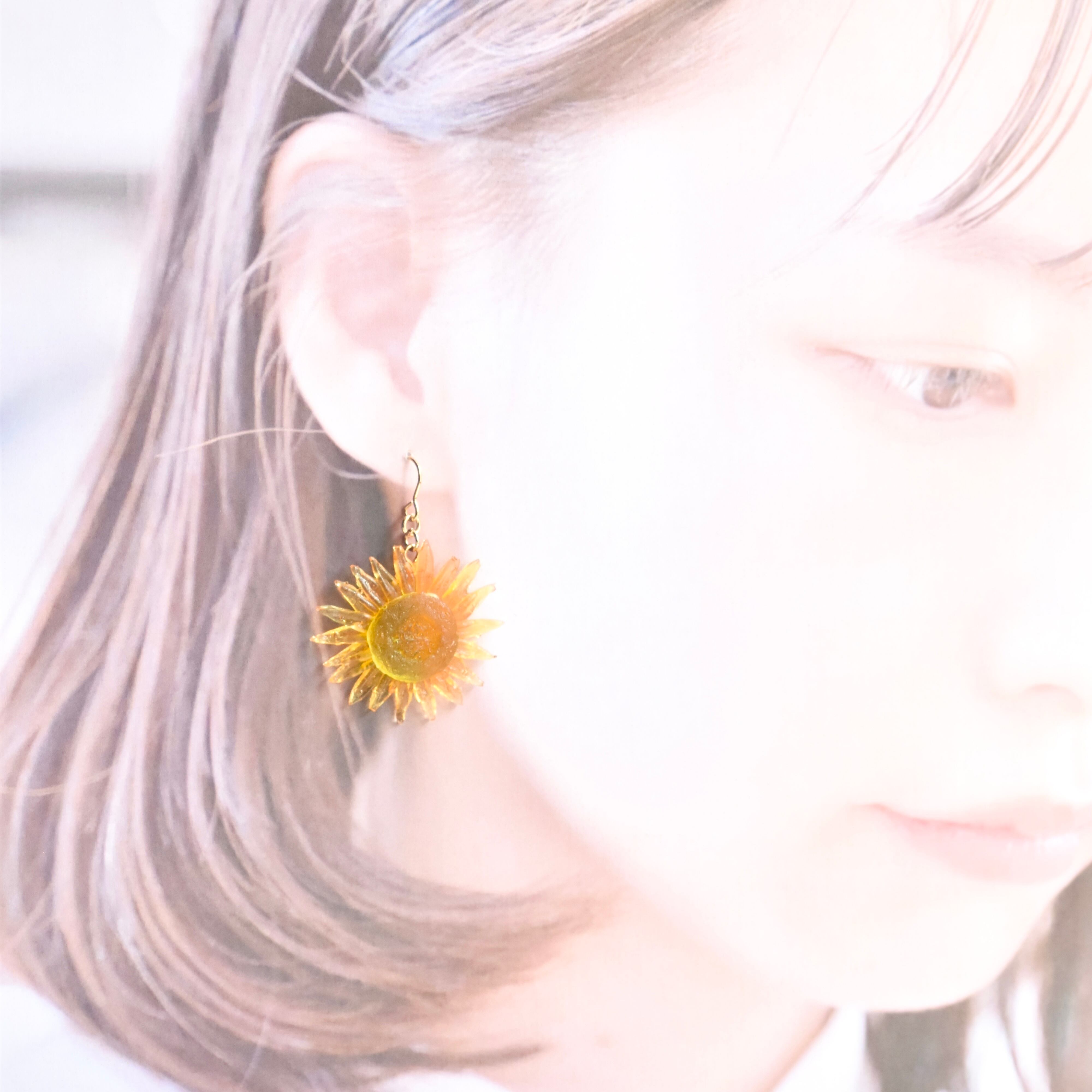 こちらは夏を象徴する花、ヒマワリのキャンディー(飴細工)をイメージしたピアス/イヤリング。