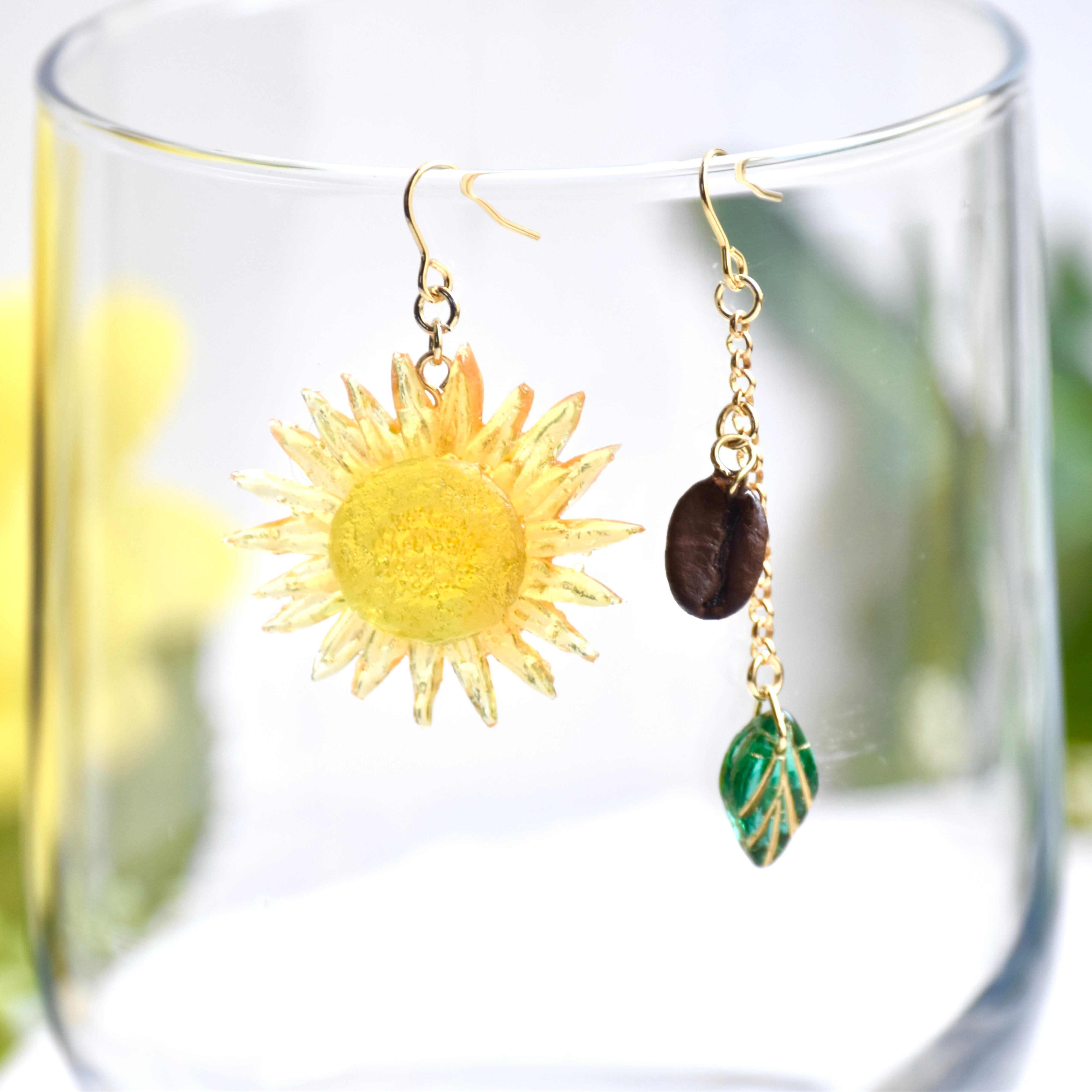 うつろう季節の水彩庭園カフェ*きらきら向日葵の大きなキャンディーとチェコビーズ&本物コーヒー豆ピアス/イヤリング イエロー×ライトグリーン【個別発送】(珈琲豆/スイーツ/飴/色ガラス風/ひまわり/シンプル/ナチュラル/韓国/春夏) /アクセサリー/フェイク/フラワー/喫茶/色ガラス/大人かわいい/ボヘミアン/花/北欧/エスニック/カントリー/個性派/リアル/カラフル/素朴/天然/自然/ナチュラル/ワンポイント/コーディネート/チェーン/ゆらゆら/リーフ/アクセント/つやつや/透明感/クリア/きれいめ/上品