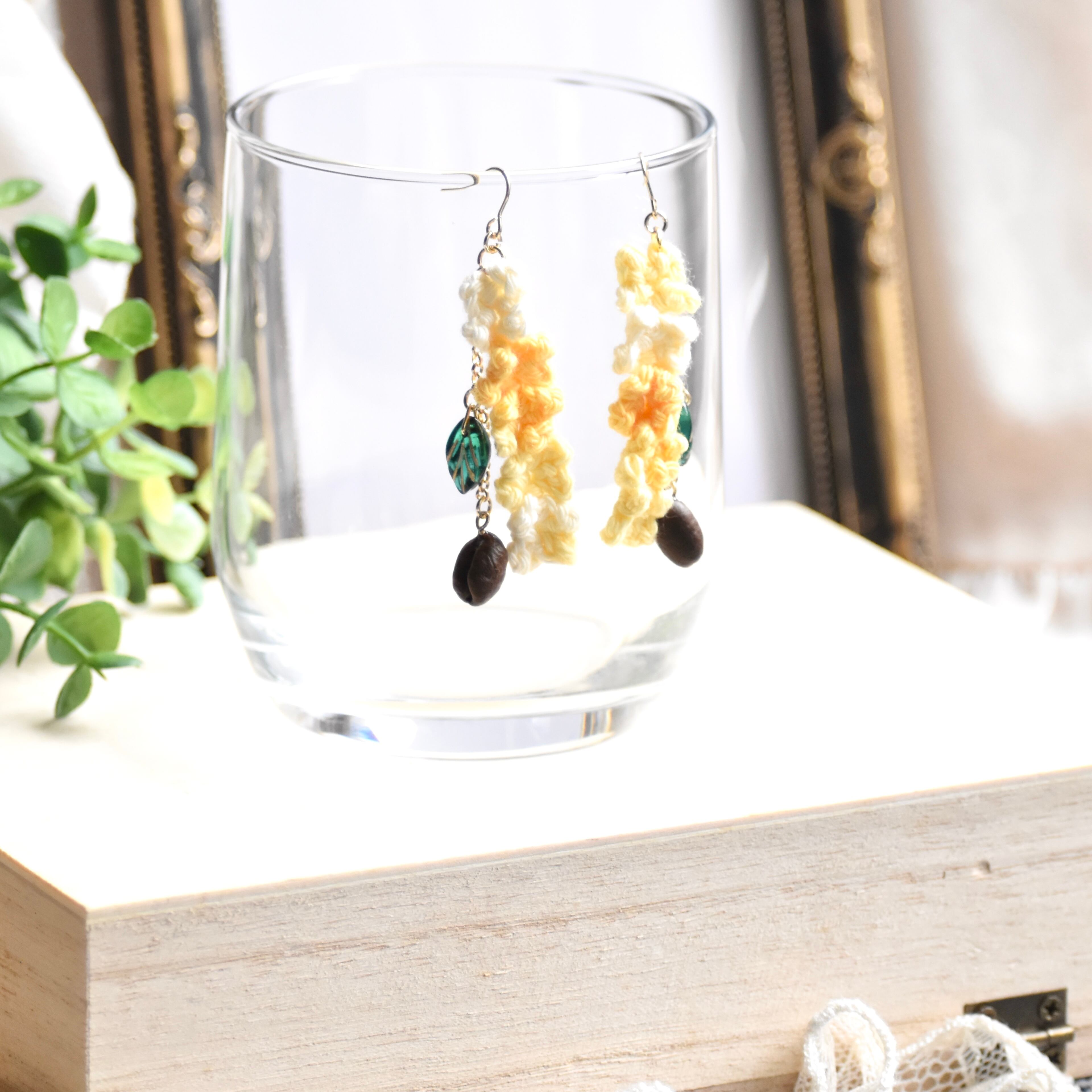 うつろう季節の水彩庭園カフェ*ふわふわキンモクセイとチェコビーズ&本物コーヒー豆ピアス/イヤリング イエローグラデーション【個別発送】(珈琲豆/アクセサリー/フェイク/フラワー/レース/喫茶/色ガラス/シンプル/大人かわいい/ボヘミアン/カントリー/秋/ふわふわ/花/北欧/エスニック/カントリー/個性派/リアル/カラフル/素朴/天然/自然/ナチュラル/ワンポイント/アクセント/コーディネート/葉/森/オレンジ/橙/黄色/緑/ブラウン/焦げ茶/ロング/チェーン/ゆらゆら/主役/色ガラス/透明感/クリア)