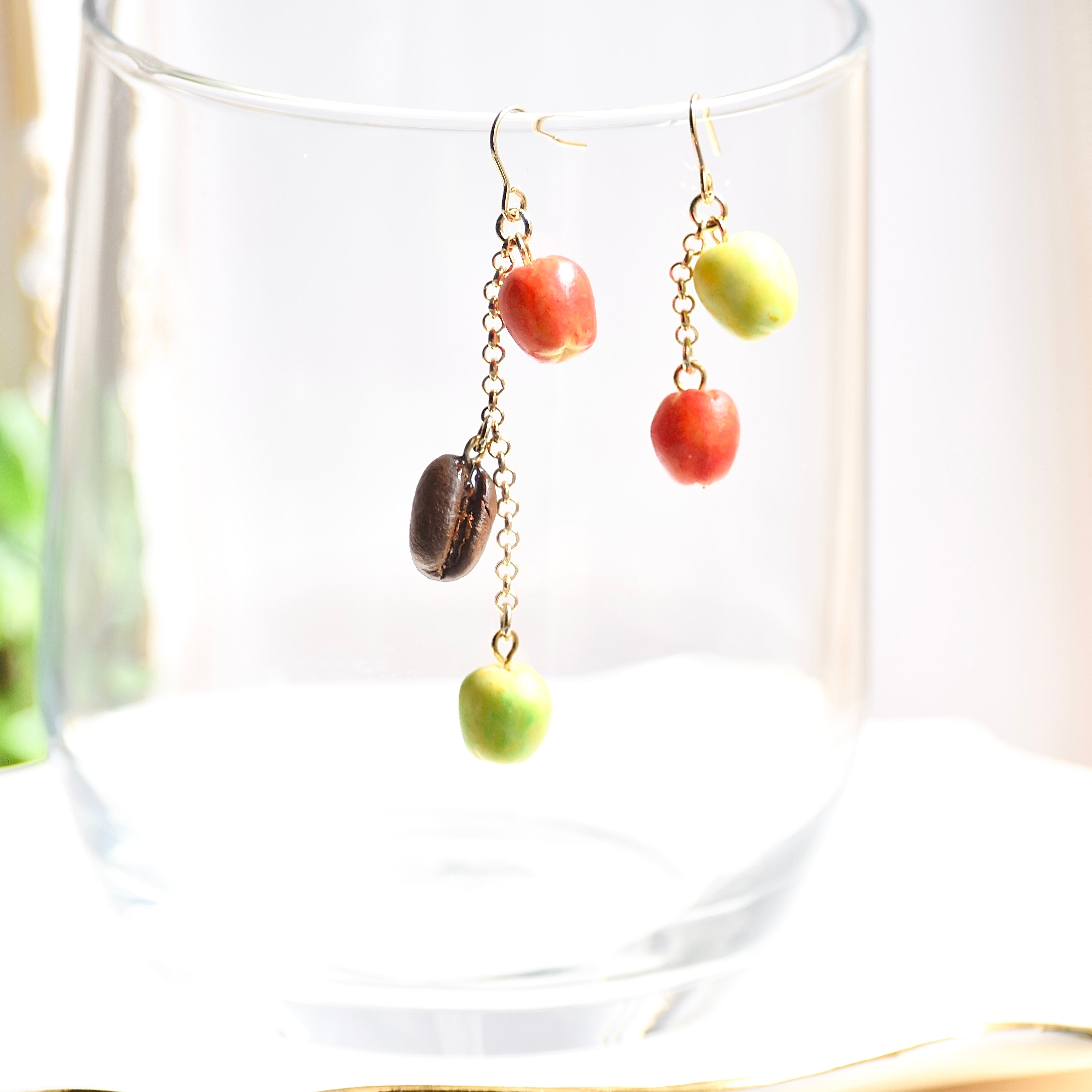 こちらは鮮やかな赤りんご(赤林檎)と青りんご(青林檎)、コーヒー豆をあしらったピアス/イヤリング。