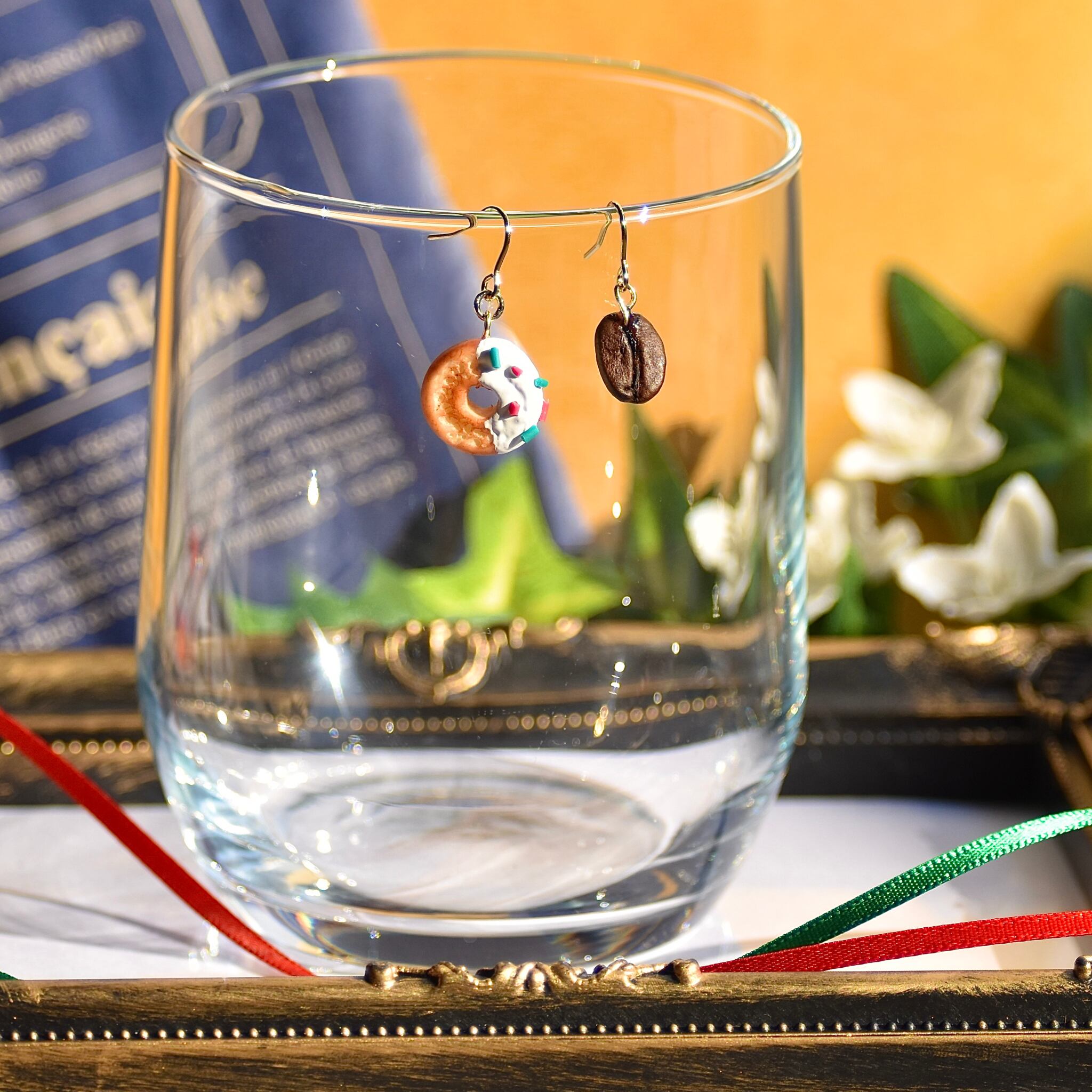 ミニチュアドーナツカフェ*クリスマスデコなオールドファッションと本物コーヒー豆ピアス/イヤリング【個別発送】(珈琲豆/スイーツ/フード/フェイク/喫茶/個性/リアル/大人かわいい/カジュアル/シンプル/セット/ユニーク/リアル/お菓子/クッキー/ビスケット/ケーキ/食べ物/おやつ/ペストリー/カフェ/パン屋/ナチュラル/アクセント/ワンポイント/プレゼント/ギフト/お祝い/誕生日/記念日/推し活/個性派/ホワイト/白/ブラウン/茶色/グリーン/緑/レッド/赤/カラフル/チョコレート/丸/サークル/円)