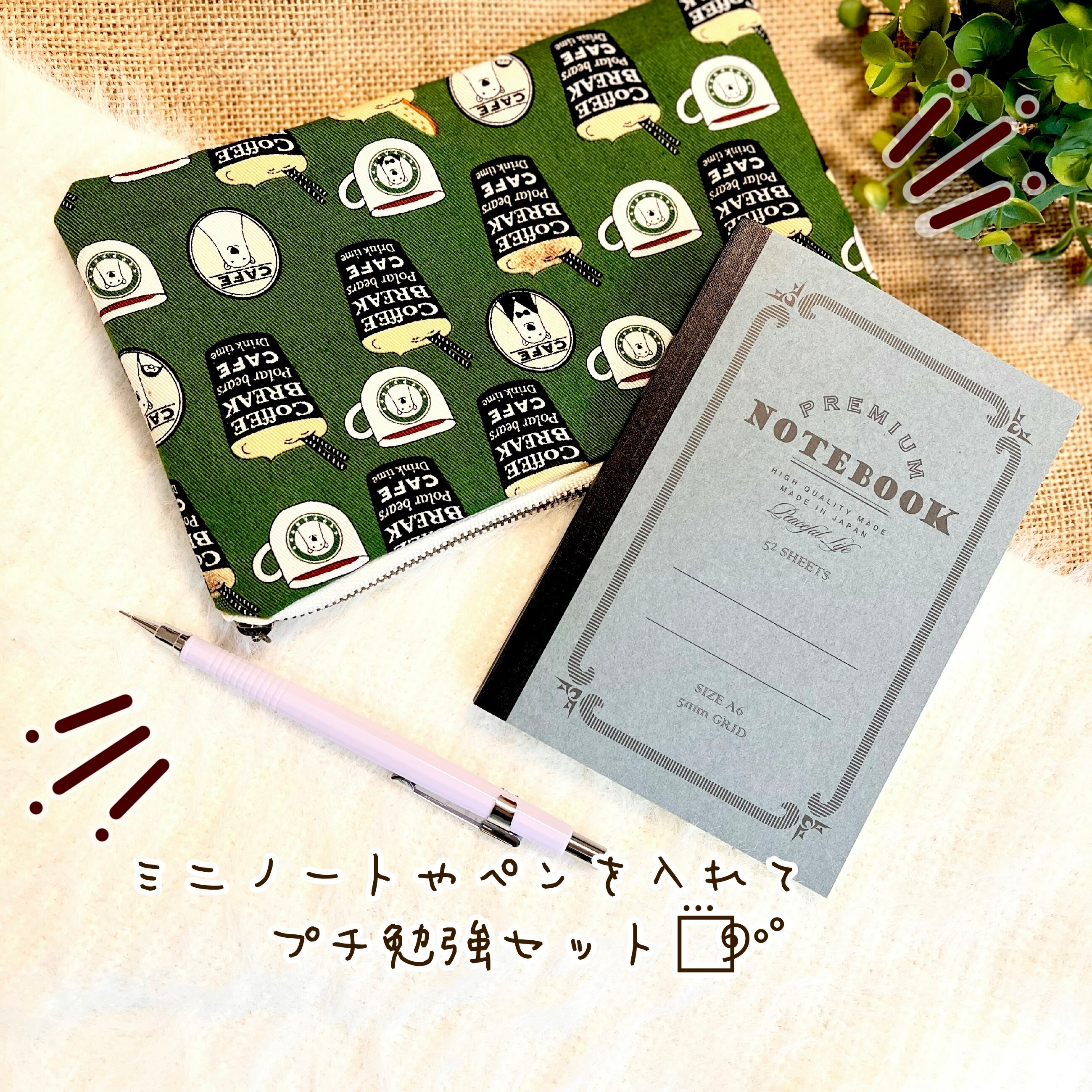 しろくま&コーヒーモチーフが散りばめられた生地で作った裏地付きのフラットポーチです。