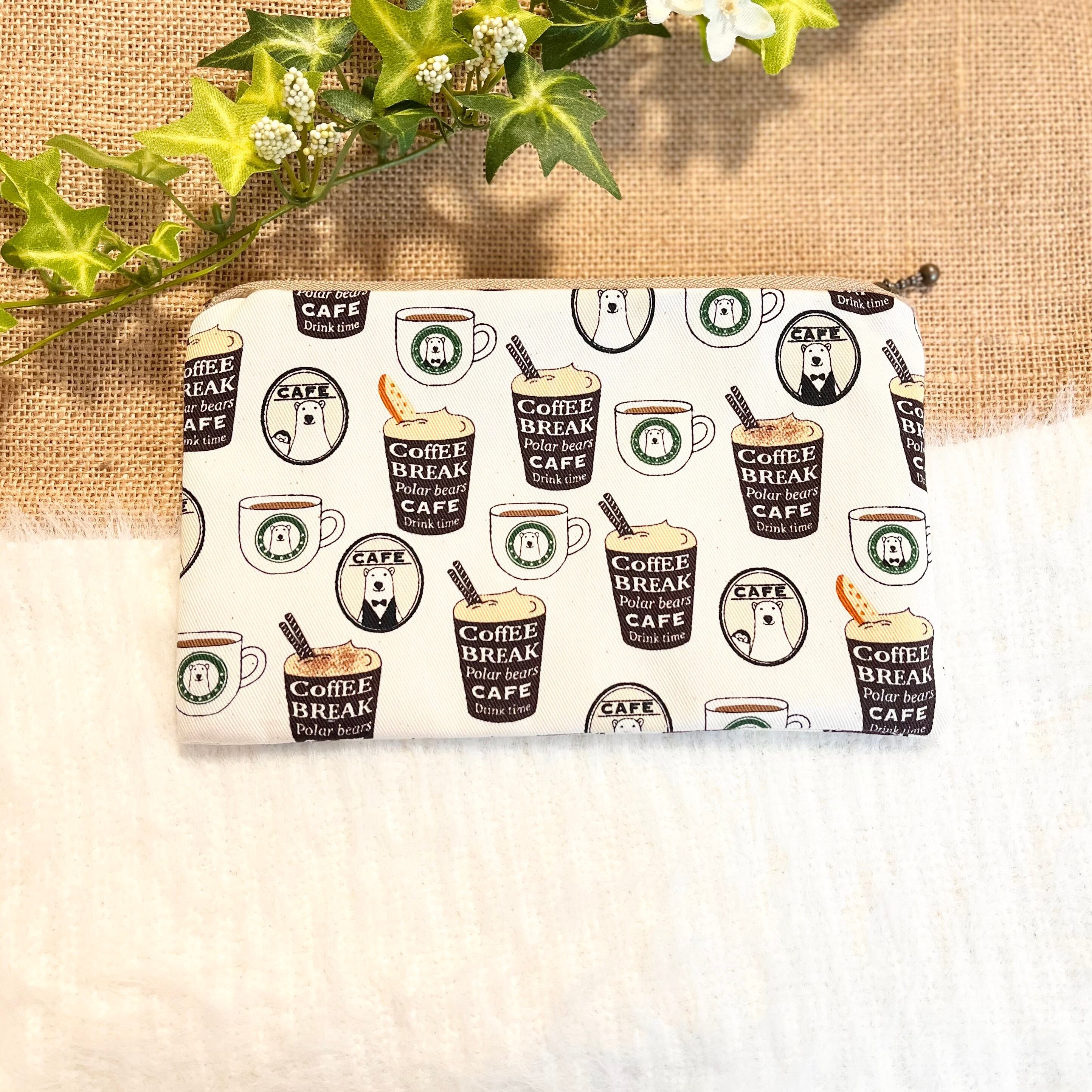 しろくま&コーヒーモチーフが散りばめられた生地で作った裏地付きのフラットポーチです。