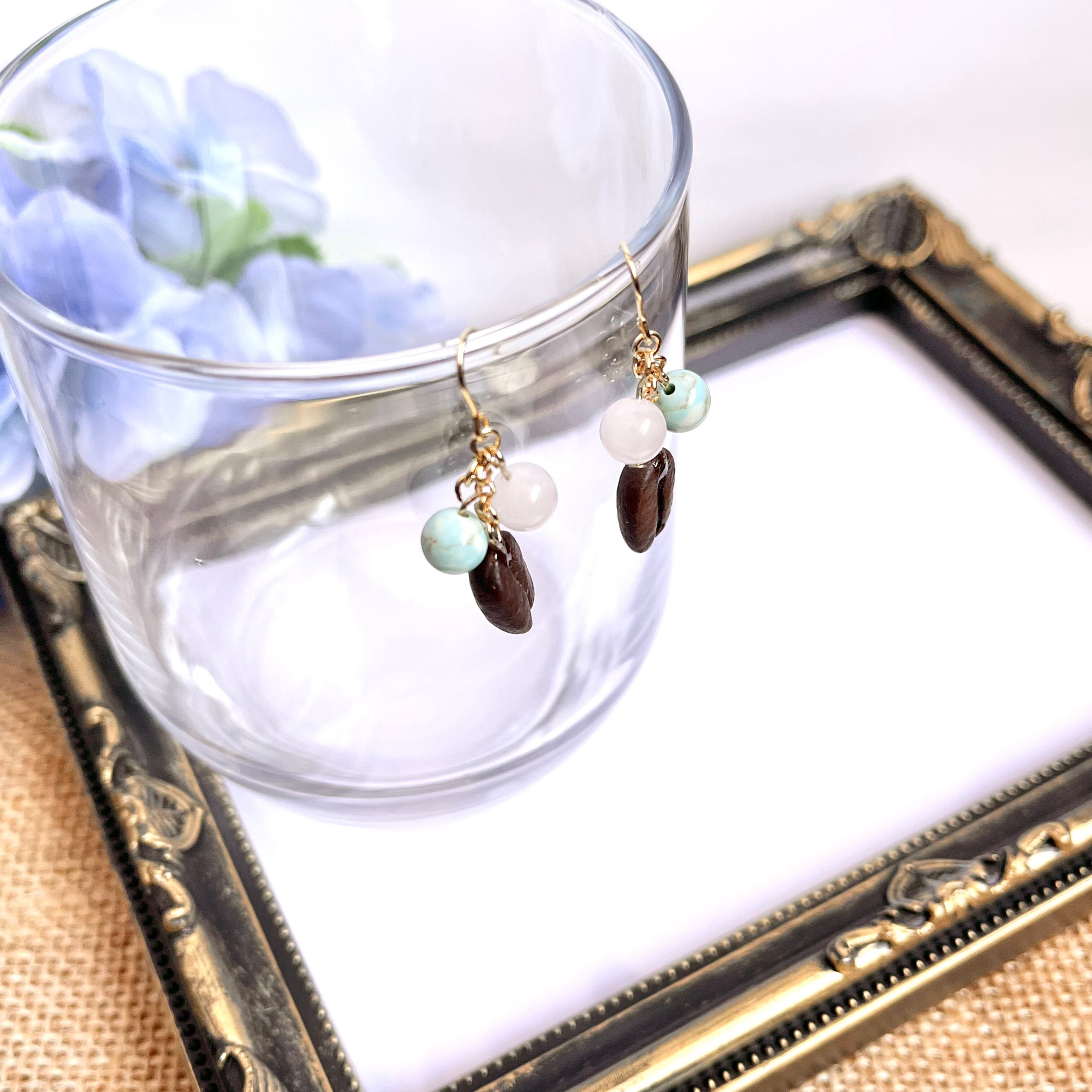 本物コーヒー豆がゆらゆら揺れる♪つやつやきらきらローズクォーツ×ターコイズ(淡色)のピアス/イヤリング【個別発送】(珈琲豆/天然石/ストーン/オケージョン/喫茶/大人かわいい/きれいめ/シンプル/韓国/女子会/パーティー/春夏秋冬/ボタニカル/上品/エレガント/アンティーク風/ヴィンテージ風/コーヒー好き/カフェ/プレゼント/ギフト/お祝い/誕生日/記念日/推し活/高級感/カジュアル/モダン/コンサバ/トレンド/コーディネート/ランチ/デート/個性派/青緑/パステル/水色/ブルー/紫/ピンク/桃//透明感