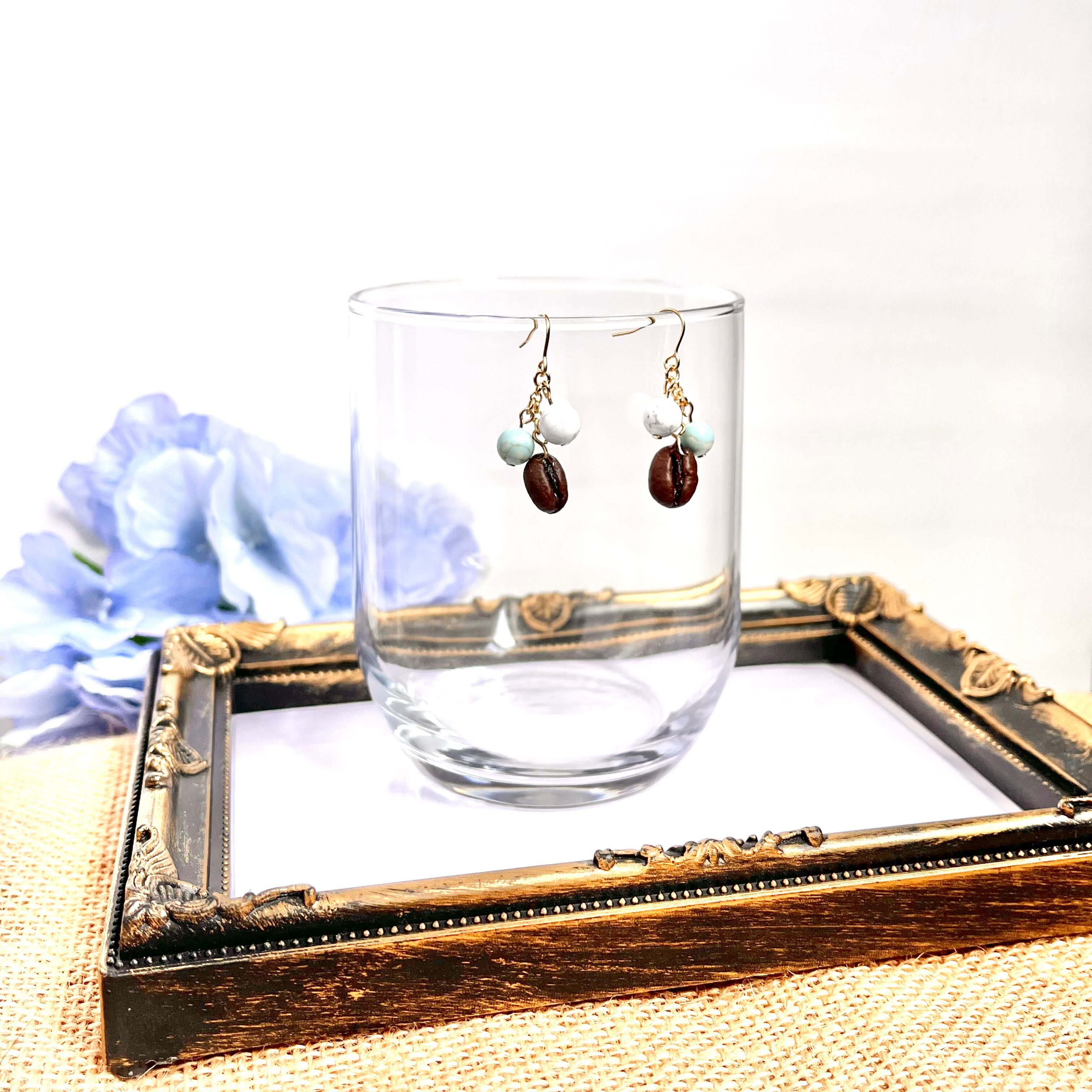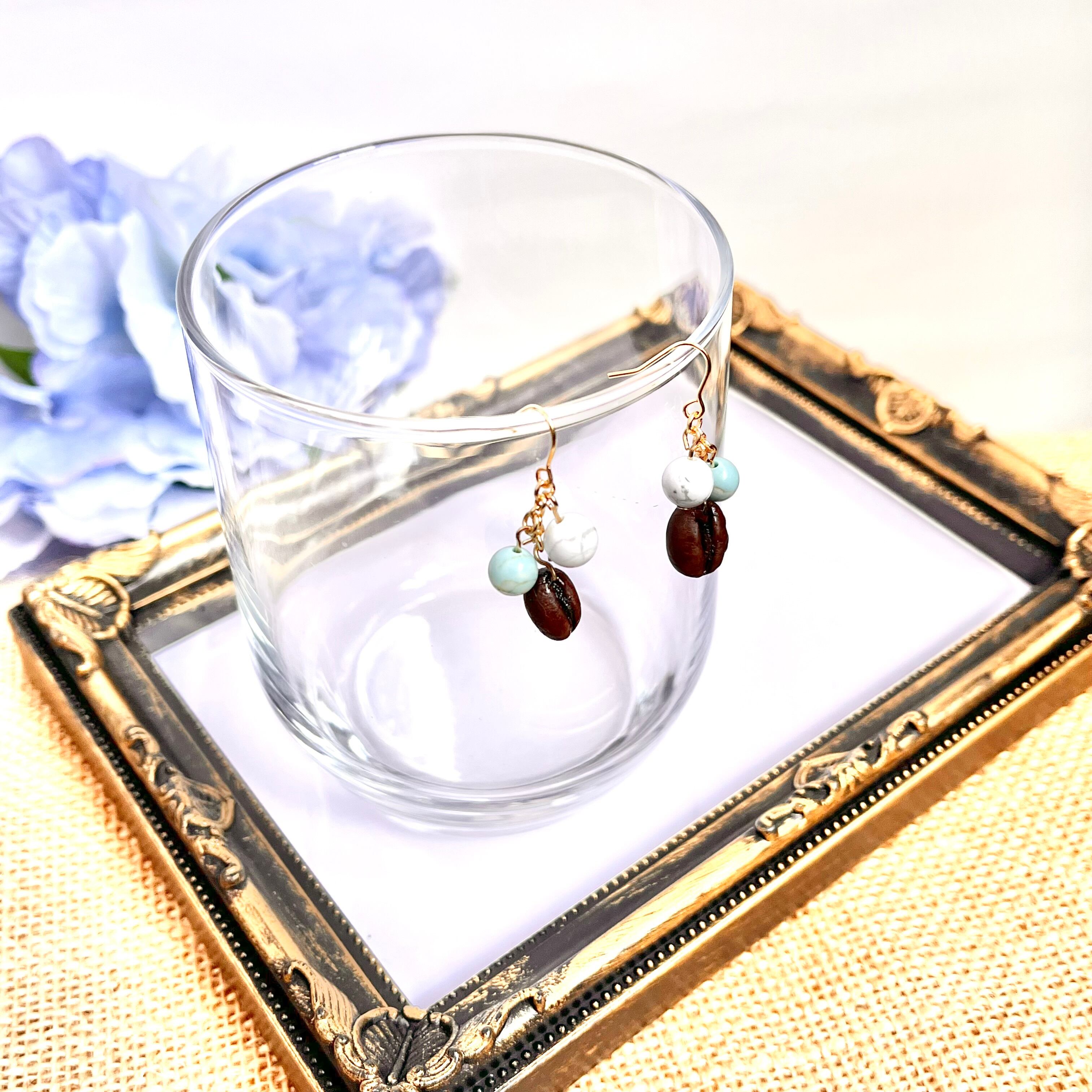 本物コーヒー豆がゆらゆら揺れる♪つやつやきらきらハウライト×ターコイズ(淡色)のピアス/イヤリング【個別発送】(珈琲豆/天然石/ストーン/オケージョン/喫茶/大人かわいい/きれいめ/シンプル/韓国/女子会/パーティー/春夏秋冬/ボタニカル/上品/エレガント/アンティーク風/ヴィンテージ風/コーヒー好き/カフェ/プレゼント/ギフト/お祝い/誕生日/記念日/推し活/高級感/カジュアル/モダン/コンサバ/トレンド/コーディネート/ランチ/デート/個性派/白/ホワイト/大理石風/マーブル/水色/青緑/透明感)