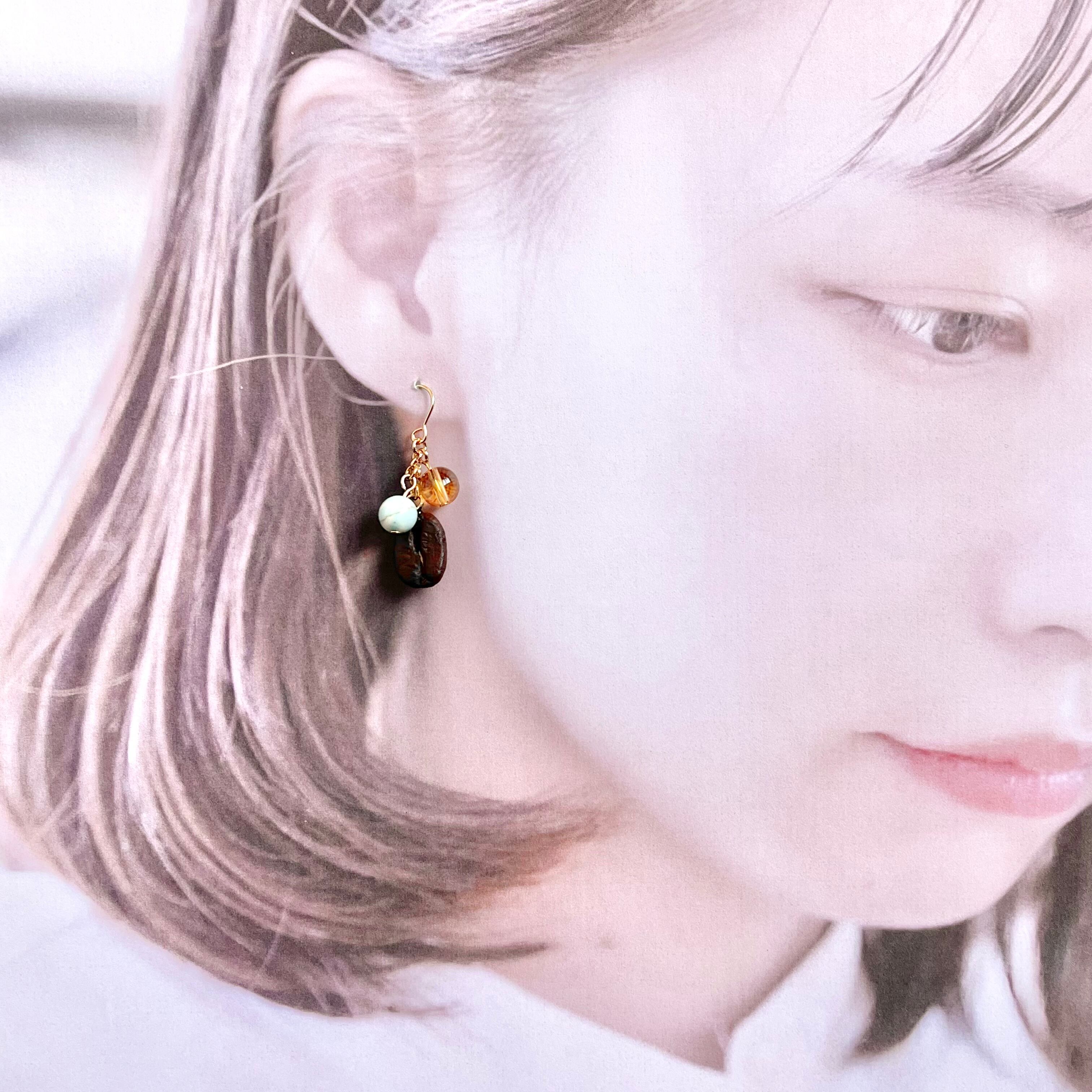 大人の上品さを演出してくれる、コーヒー豆と天然石をあしらったエレガントなピアス/イヤリングです。
