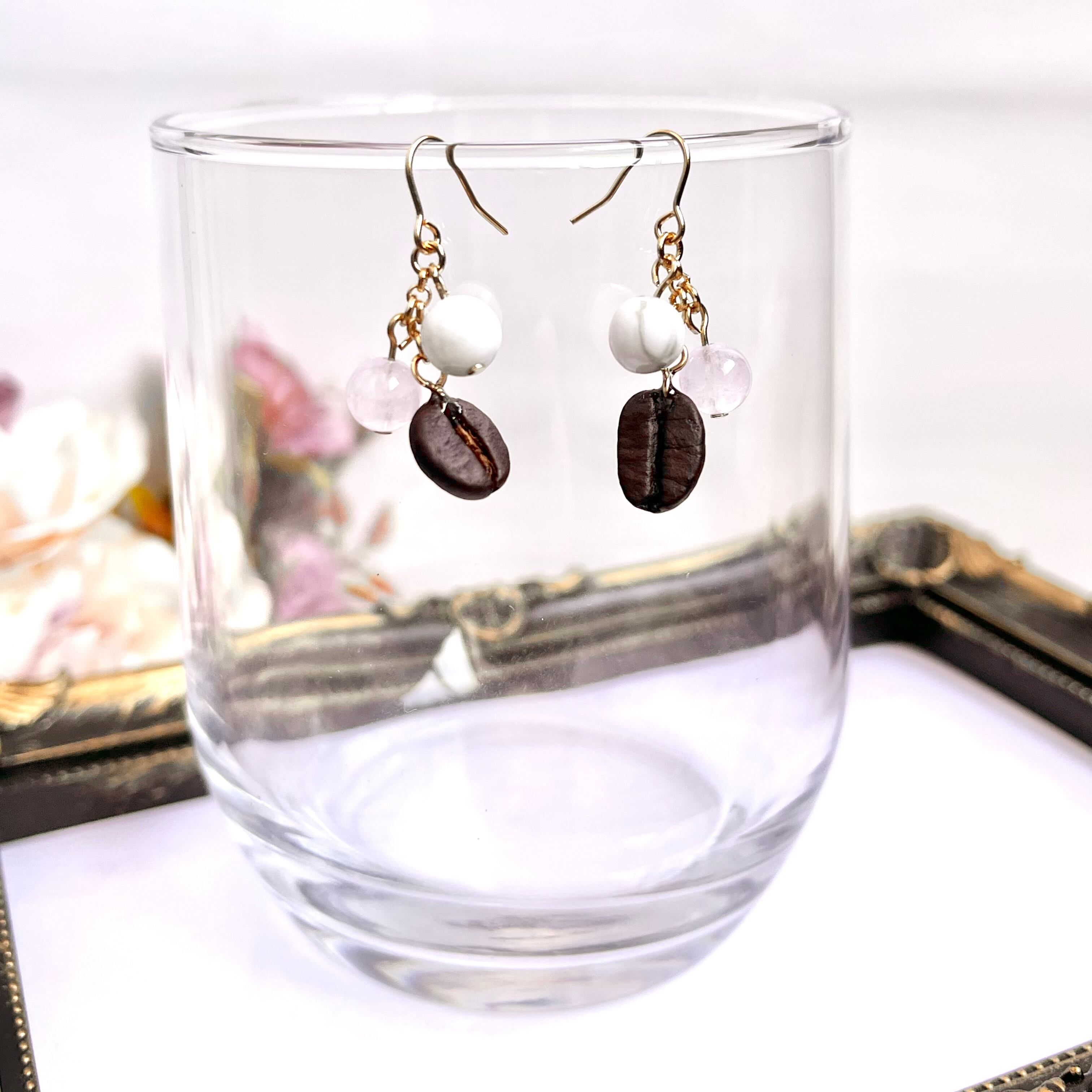 天然石と一緒にゆらゆら揺れるのは、ちょこんとしたサイズ感がかわいいコーヒー豆を2粒。