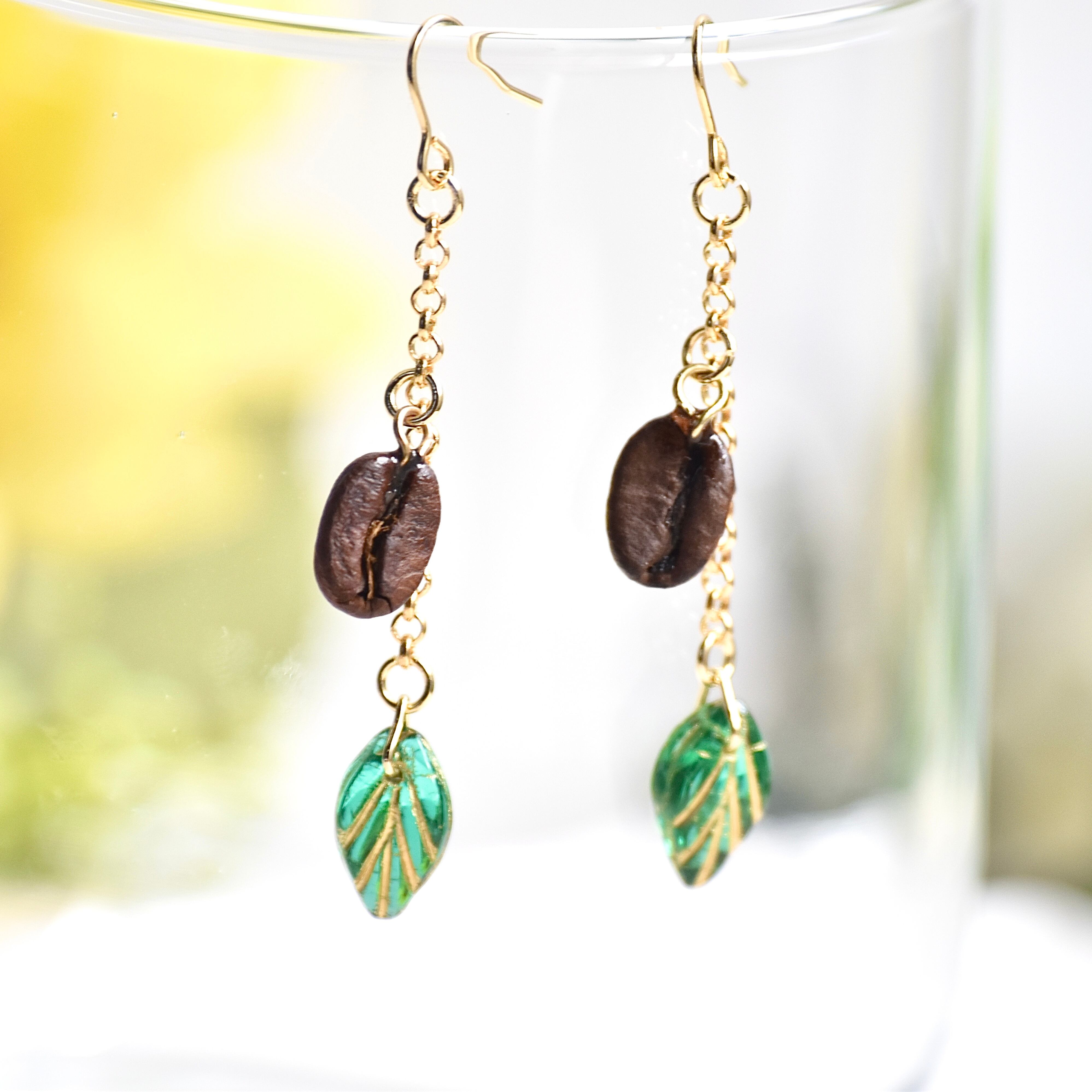 うつろう季節の水彩庭園カフェ*きらきらチェコビーズの青葉&本物コーヒー豆 ピアス/イヤリング(ロングタイプ)【個別発送】(珈琲豆/喫茶/色ガラス風/クリアカラー/レトロ/透明感/葉/リーフ/グリーン/リアル/シンプル/春夏/きらきら/ナチュラル/オケージョン/きれいめ/ボタニカル/上品/エレガント/アンティーク風/ヴィンテージ風/大人かわいい/コーヒー好き/プレゼント/ギフト/お祝い/誕生日/記念日/推し活/高級感/カジュアル/モダン/ユニーク/トレンド/コーディネート/女子会/ランチ/デート/個性派)