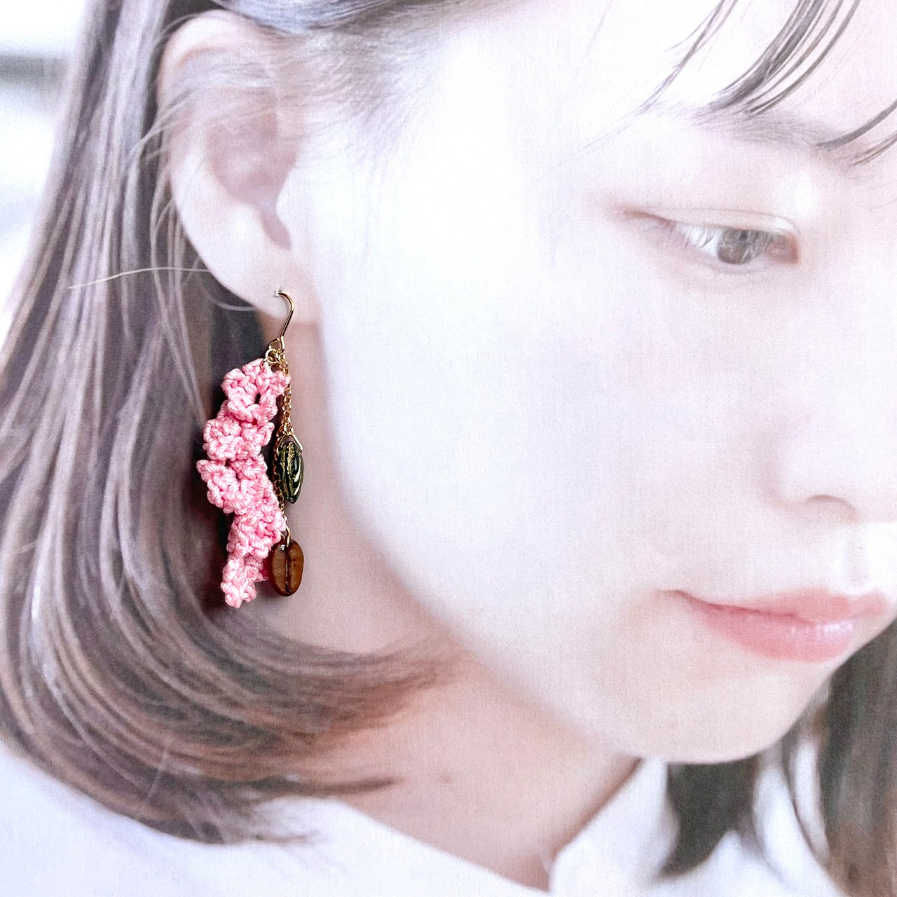 サクラがふんわり香る中、あたたかな春の光に包まれながらほっこりと過ごすカフェタイムをイメージして仕上げたピアス/イヤリングです。