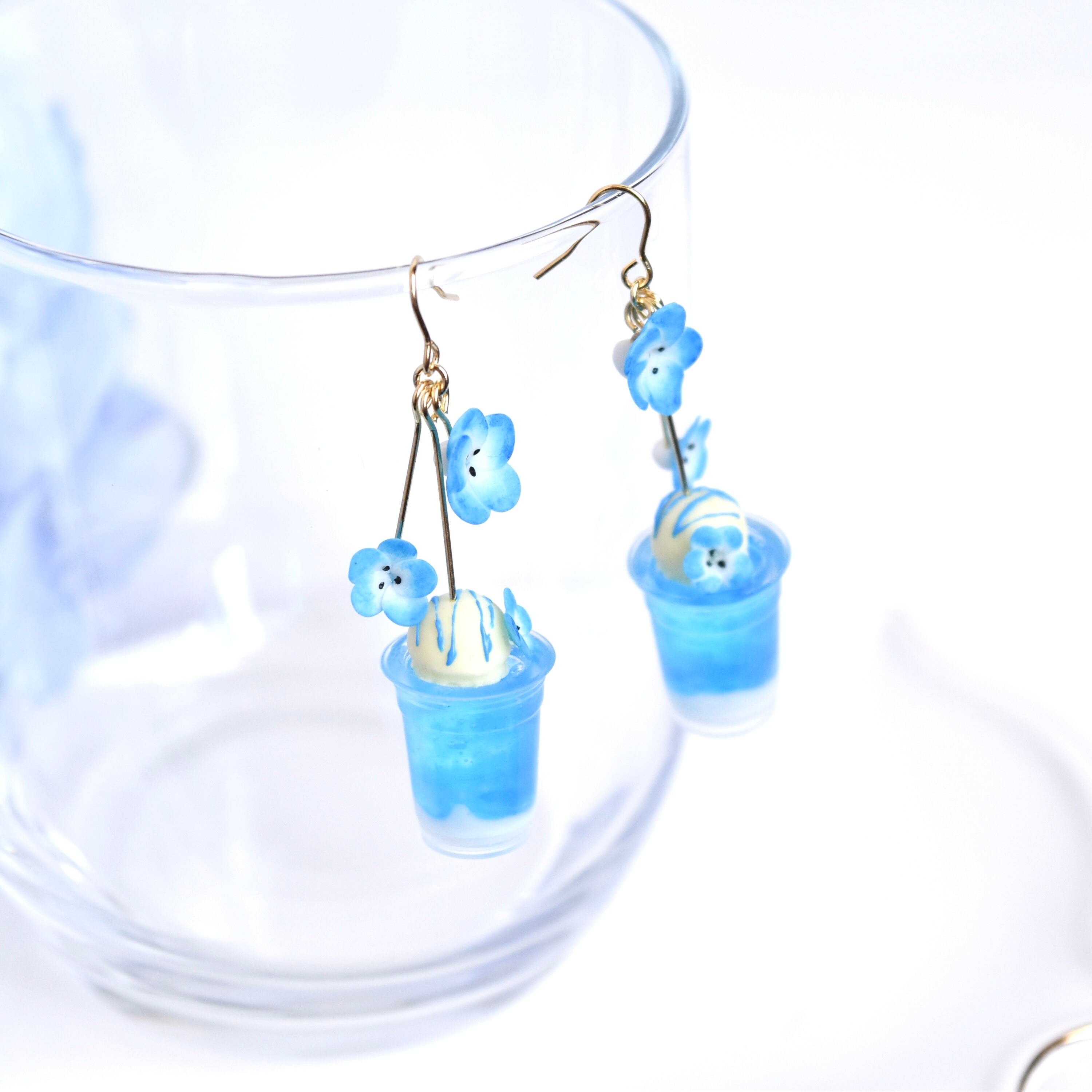 春の喫茶店*ネモフィラの花畑のクリームソーダ ミニチュア ピアス/イヤリング オリジナルディスプレイ台紙付き【個別発送】
