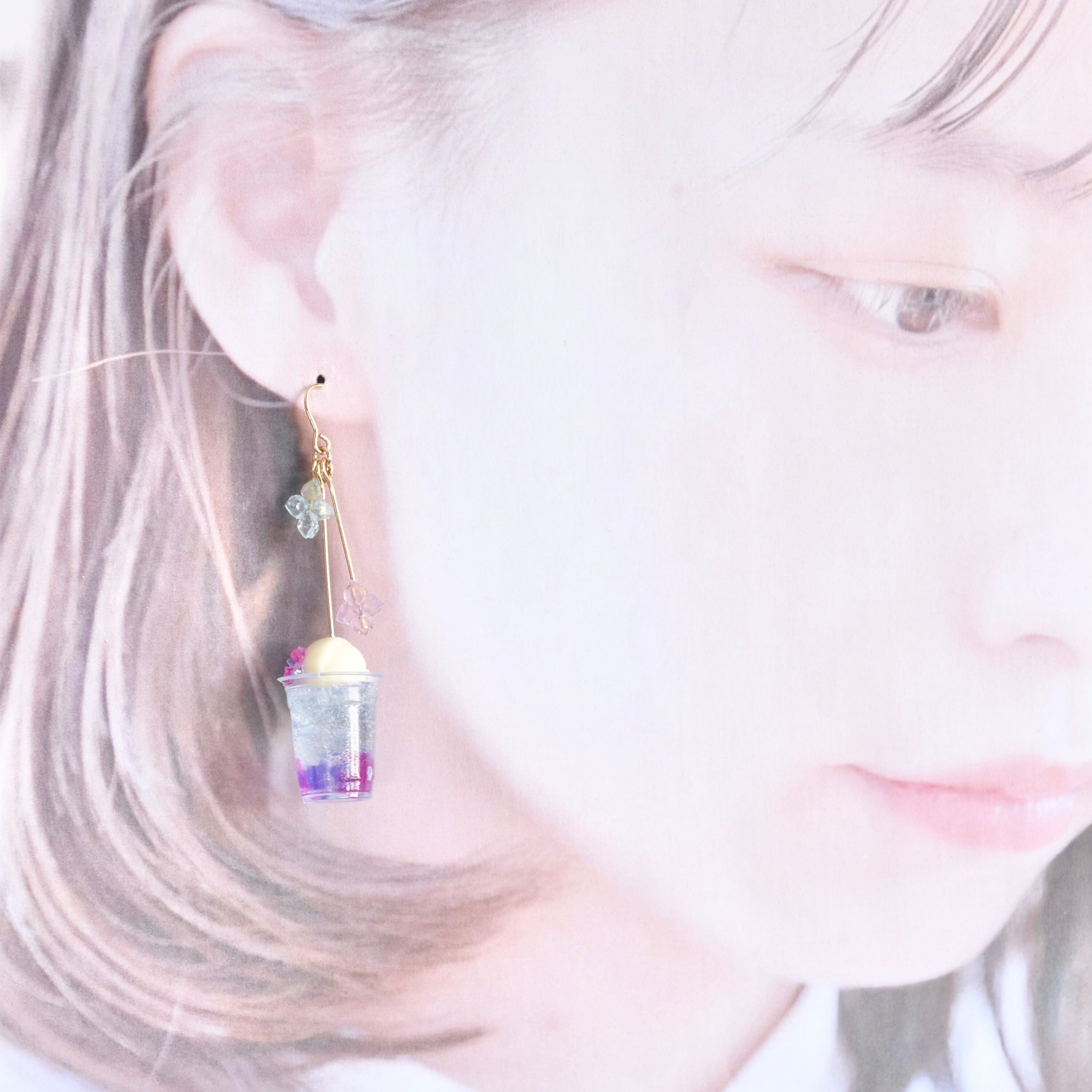 夏の喫茶店*紫陽花ゼリーの花畑のクリームソーダ ミニチュア ピアス/イヤリング オリジナルディスプレイ台紙付き【個別発送】(ドリンク/喫茶/色ガラス風/リアル/きれいめ/きらきら/花/紫陽花/ブルー)
