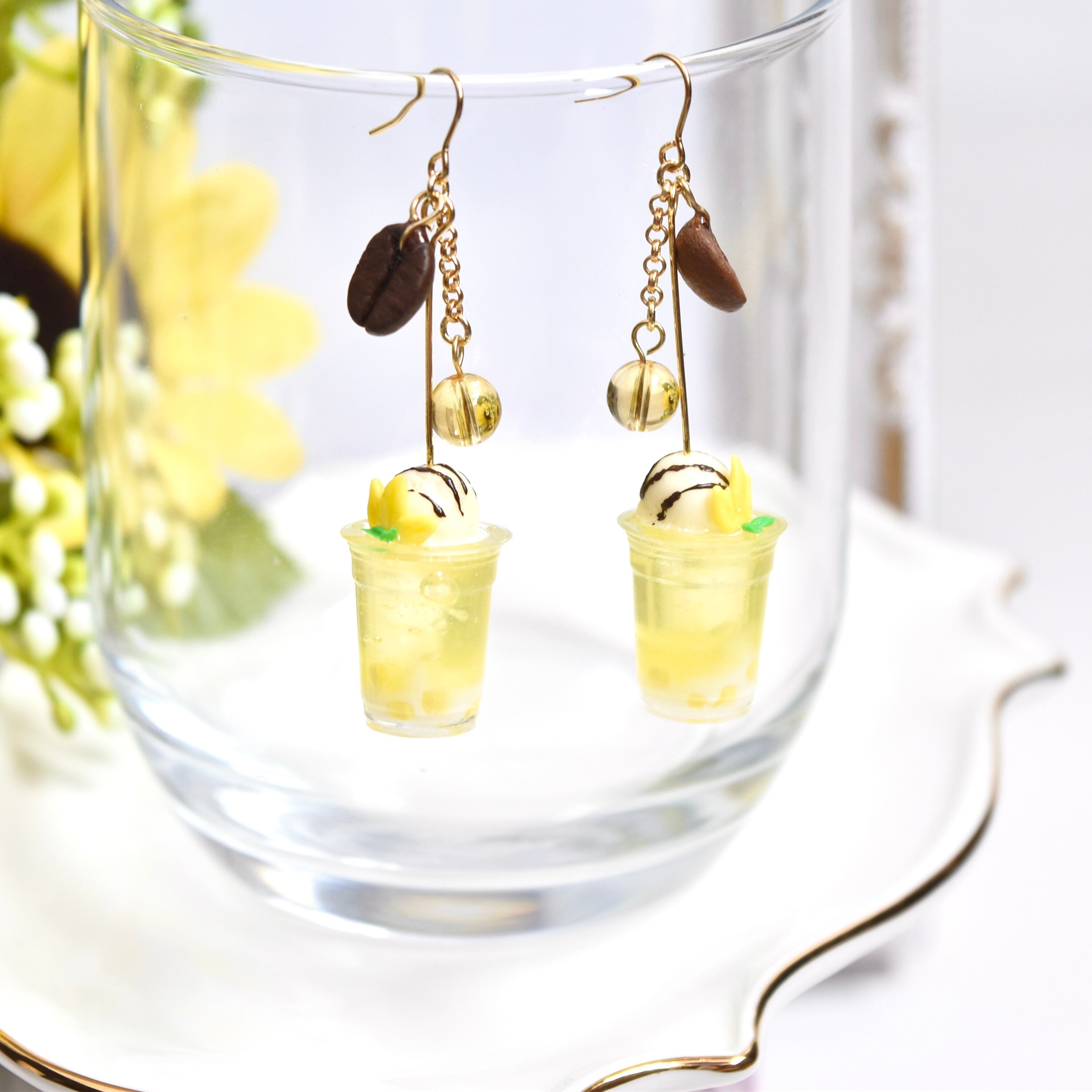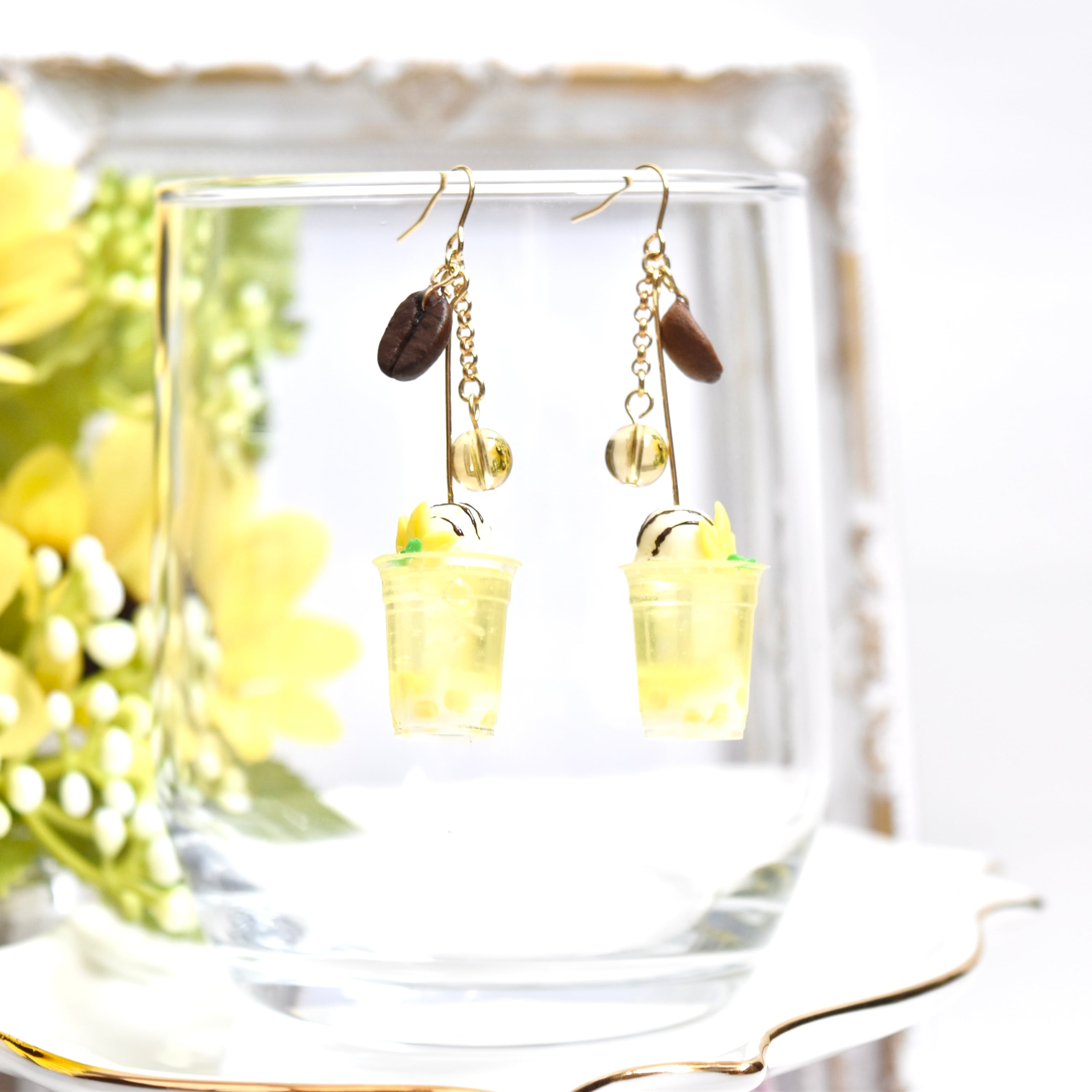 夏の喫茶店*本物珈琲豆とシトリン揺れる向日葵パインヨーグルトクリームソーダ ミニチュア ピアス/イヤリング オリジナルディスプレイ台紙付き【個別発送】(ドリンク/喫茶/色ガラス風/リアル/きれいめ/きらきら/花/ひまわり/黄色