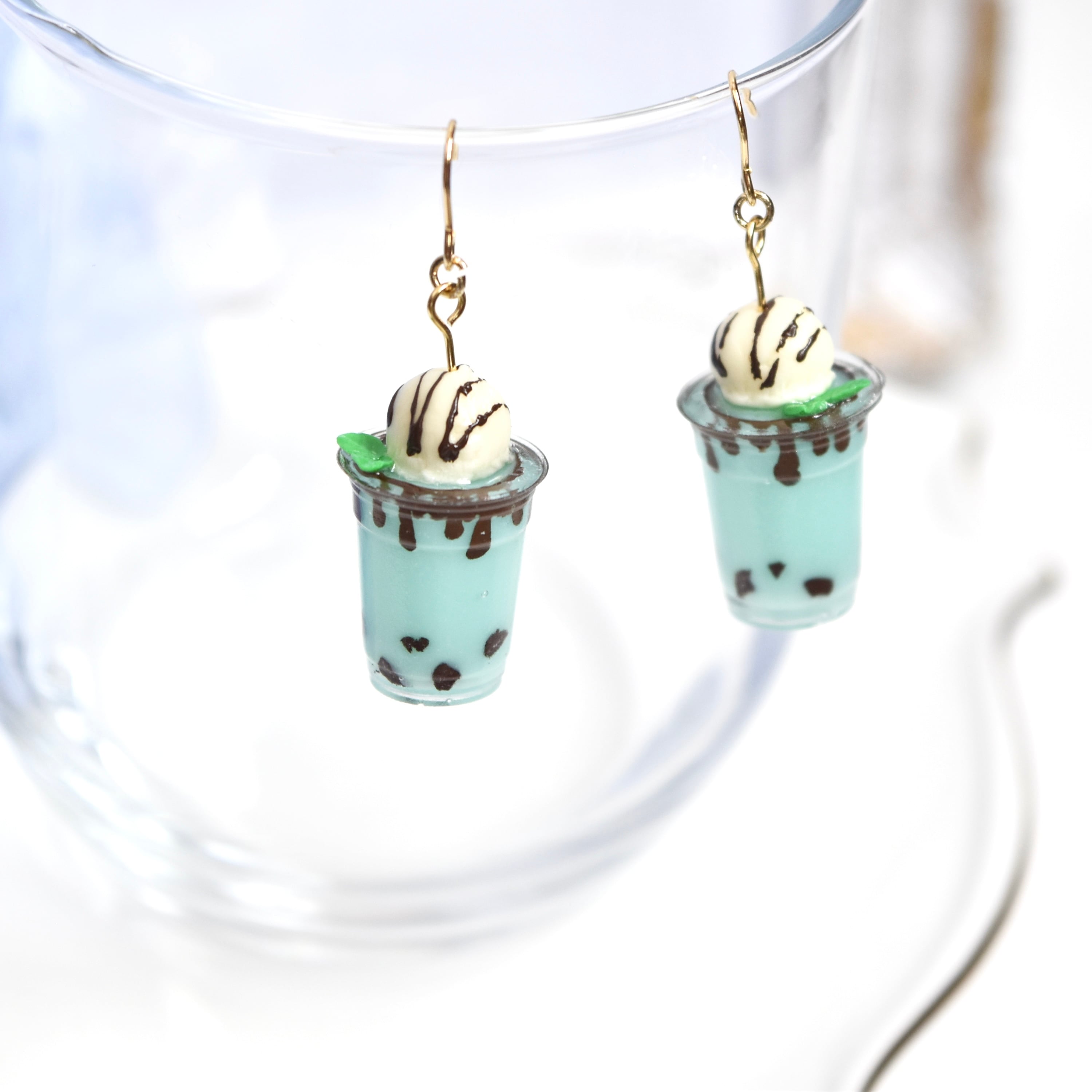 レトロ水彩カフェ*すっきりとろ~りチョコミントフラッペ(フローズン) ミニチュア ピアス/イヤリング オリジナルディスプレイ台紙付き【個別発送】(ドリンク/喫茶/色ガラス風/ぶどう/青/ブルー/リアル/シンプル/きらきら