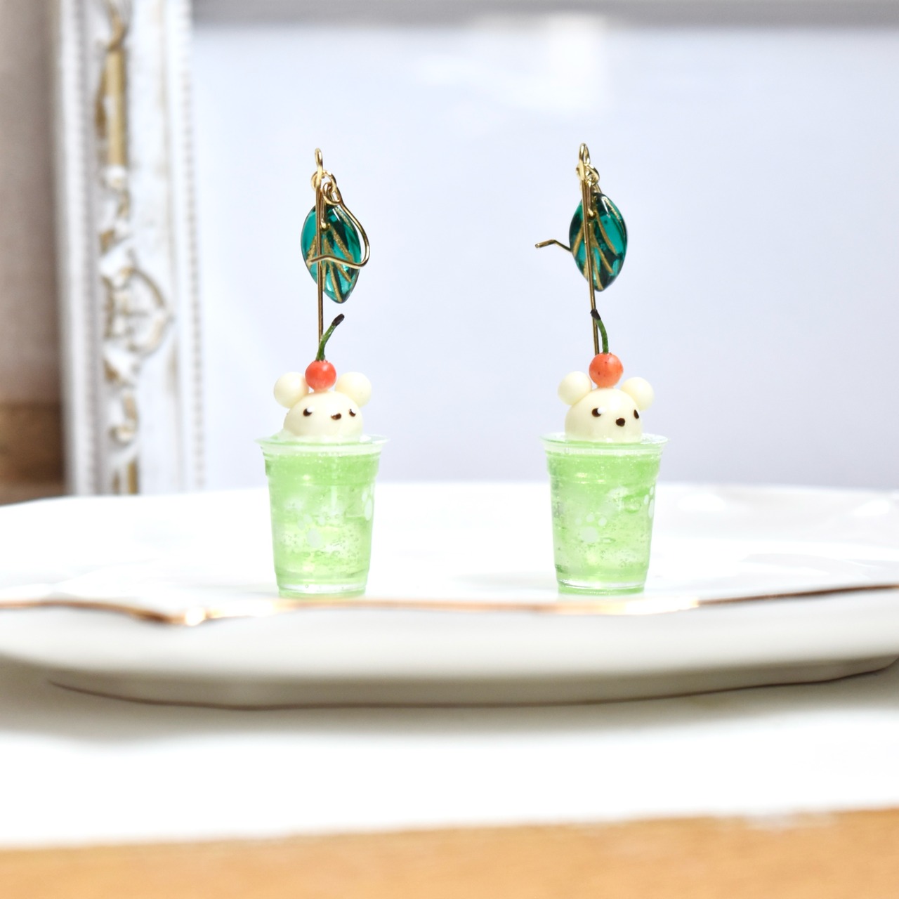 どうぶつたちの隠れ家カフェ*レトロメロンのくまさんクリームソーダ(ソーダ・サイダー) ミニチュア ピアス/イヤリング オリジナルディスプレイ台紙付き【個別発送】
