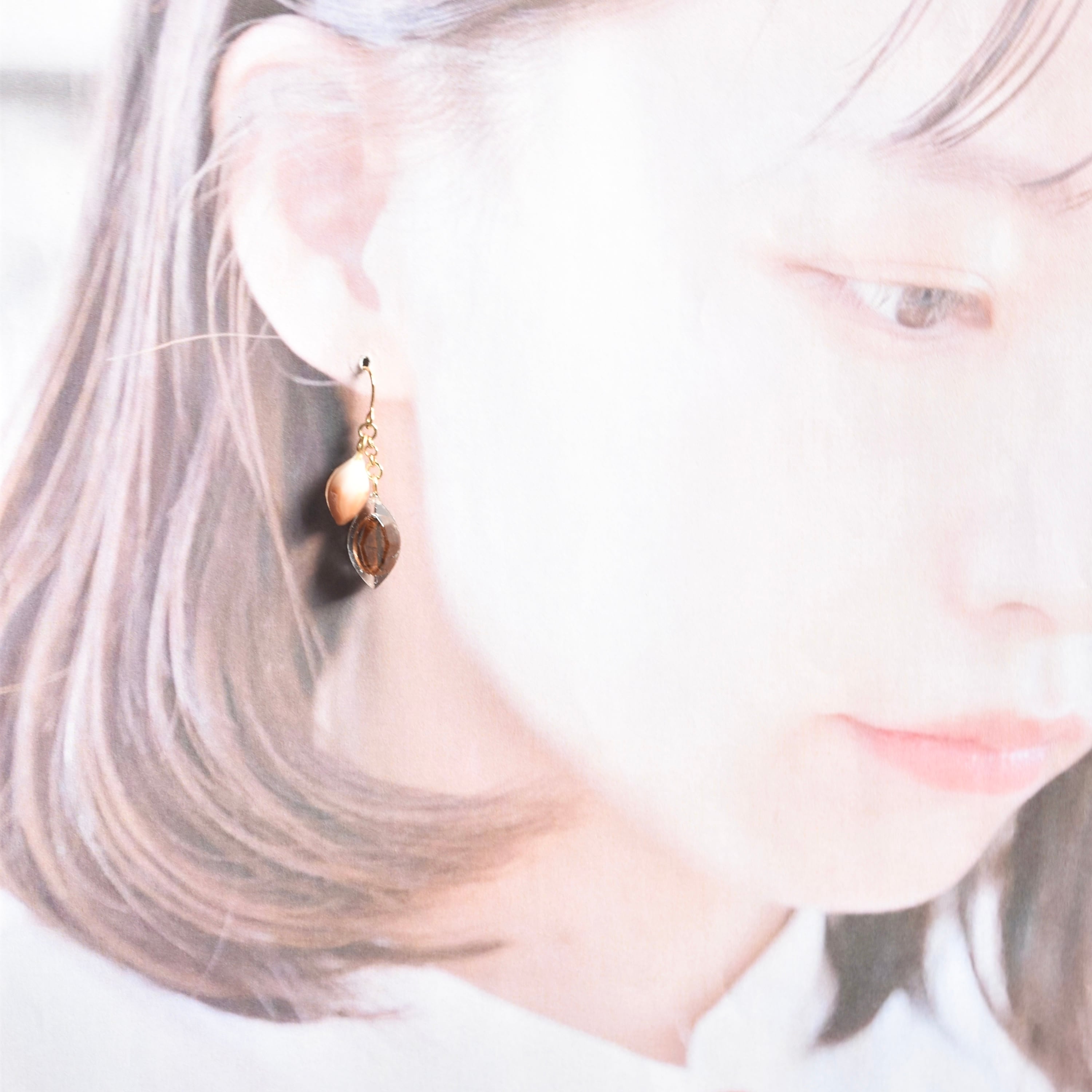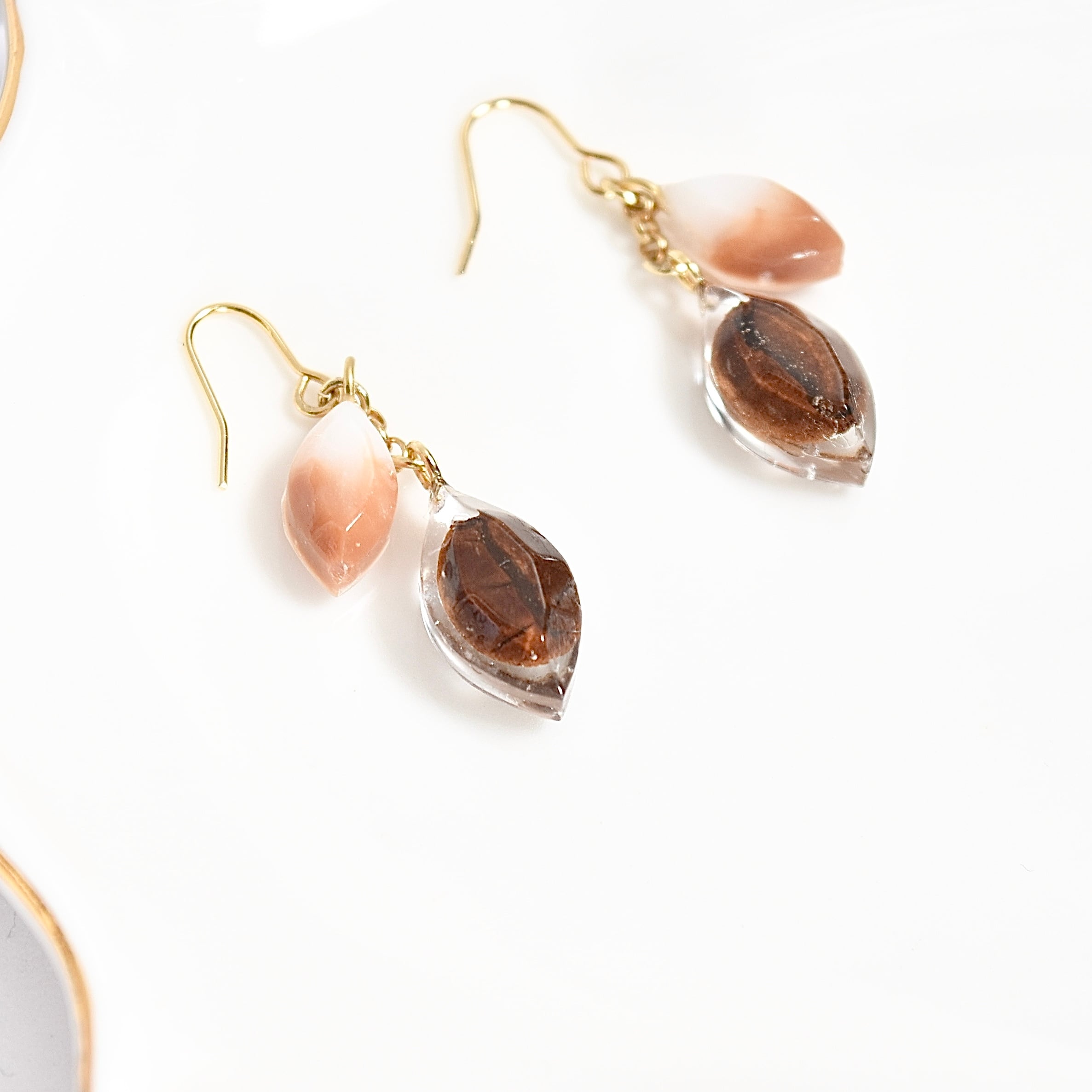 大人の上品さを演出してくれる、カフェオレカラーのパーツ、コーヒー豆と透明感あるパーツをあしらったエレガントなピアス/イヤリングです。