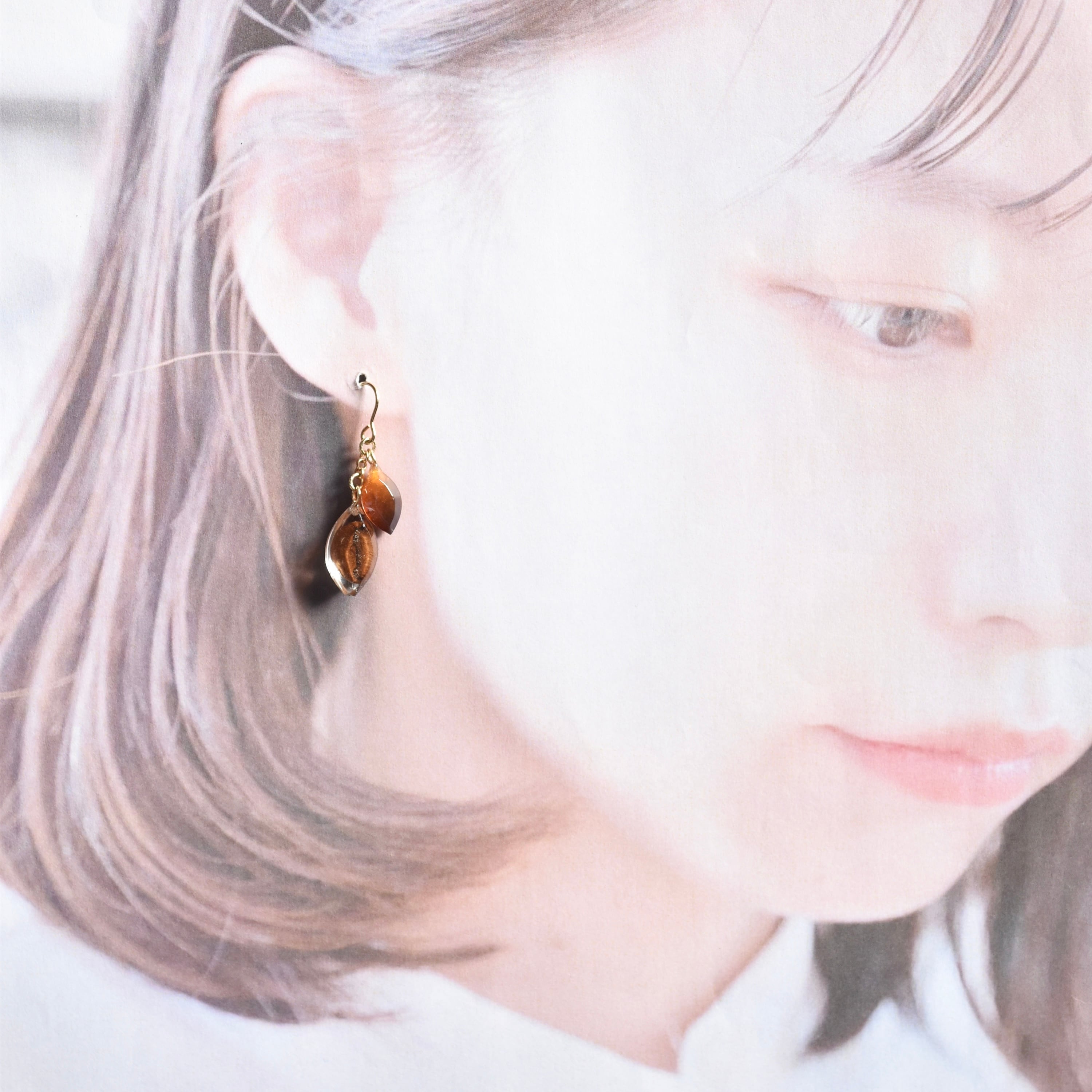 大人の上品さを演出してくれる、珈琲カラーのパーツ、コーヒー豆と透明感あるパーツをあしらったエレガントなピアス/イヤリングです。